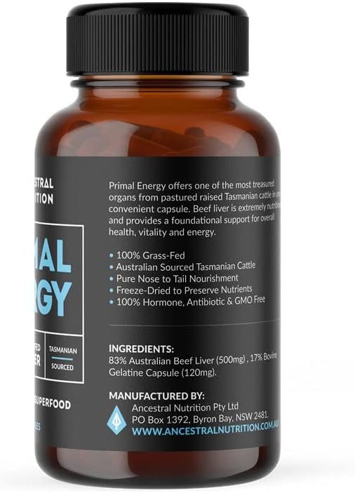 Do you always feel fatigued, tired, or struggle with low energy, immune health or metabolism? Then, this Nature’s superfood beef liver ancestral nutrition is what you need to fulfill all your nutrient needs and to supercharge your body to activate you all day long. The powerhouse magic capsules leave you feeling refreshed and energetic with more restorative sleep. Beef liver offers the specific vitamins and minerals that play a critical role in making healthy red blood cells which is the key to enjoying all-day energy. These desiccated beef liver capsules are sourced from the highest quality grass-fed Australian beef organs. They are one of the most nutrient-rich superfoods to support overall health and vitality. The beef organ meats are freeze-dried to preserve nutrients so that you get maximum benefits from the organ capsules. Each bottle contains 120 capsules that last for up to 30 days. Adults can take 4 capsules daily. The beef liver capsules are safe to be taken by children as well. We recommend 1 capsule for every 10kg (or less) of children’s body weight and advise starting on a single capsule daily for the first week to ensure tolerability. The capsules may be opened and sprinkled onto food, into a drink/smoothie, or taken whole. You can take Primal Energy any time of day as it doesn’t contain any sugar or caffeine. Though we recommend having it in the morning to start your day with a foundation for lasting energy. Get one step closer to a healthier you with beef liver supplements primal energy capsules packed with full of nutrients.