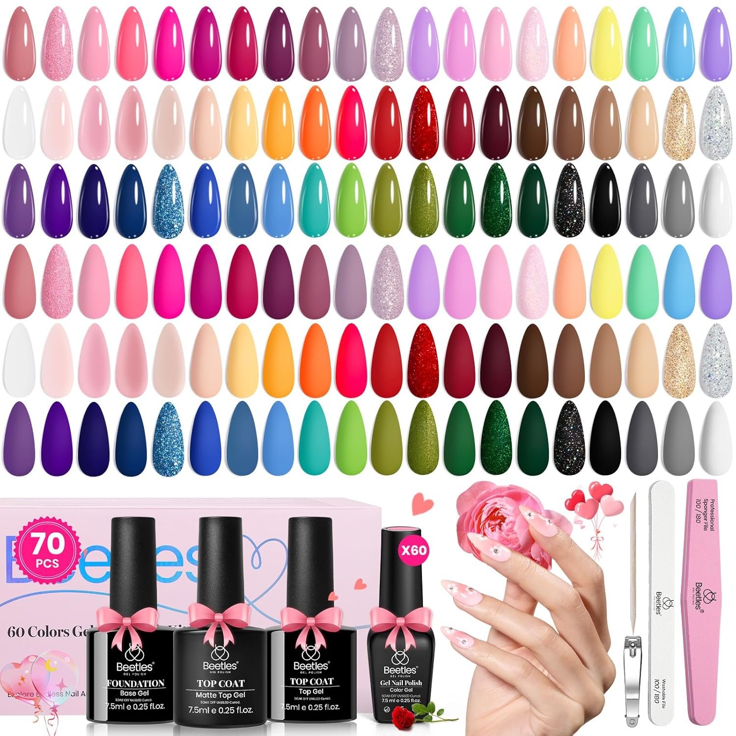 【60 Colors Gel Nail Polish Set】The beetles gel nail polish set contains 60 nail colors carefully selected by us to cover the four seasons, let you can find suitable and beautiful colors in different occasions of the four seasons. The gel nail polish set includes 5ml*60 color gel nail polish, 7.5ml*2 base coat, 7.5ml*2 glossy top coat, 7.5ml*1 matte top coat,1*nail file, 1*nail buffer, 1*nail clipper ,1*cuticle stick and 1*instruction manual