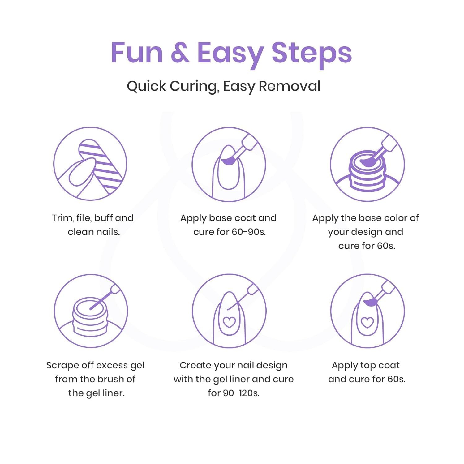 【Application】Just make sure you wipe your brush; otherwise, you’ll get a big drop. This is a nail art liner gel polish. It must be cured using an LED UV Nail Lamp. Base and Top coat are required. Average for an LED nail lamp is 60-120 secs.