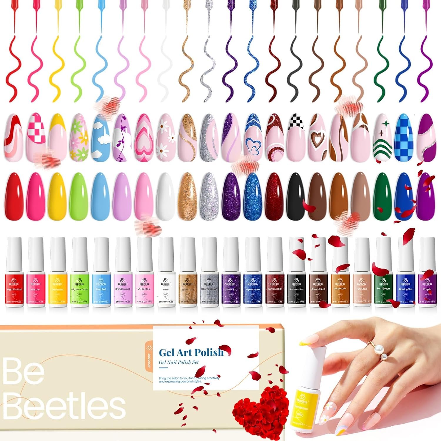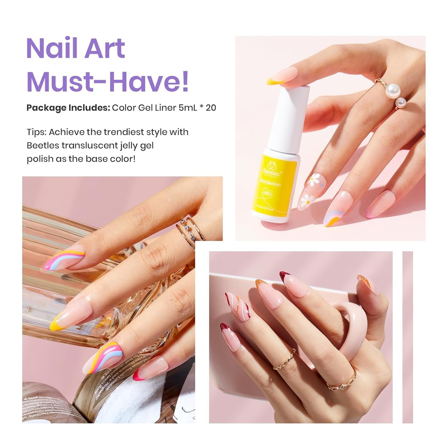 beetles Gel Polish Nail Art Gel Liner Nail Polish Set- 20 Colors Liner Gel Polish Pink Blue White Red Brown Glitter Gel Nail polish Soak Off UV Gel Built Thin Nail Brush in Bottle Gifts for Women