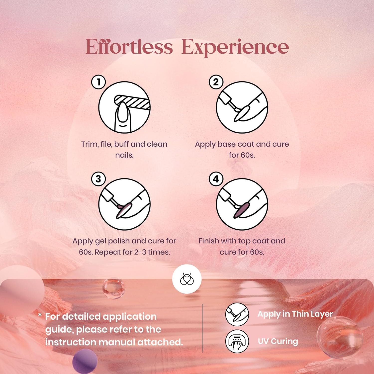 Sheer Gel Polish: The color is from clear translucent to solid opaque. One layer, two layers, and three layers have different effects. This item is UV gel. It is still sticky after curing. It must be used with a base coat and top coat. Please read the directions for use carefully.