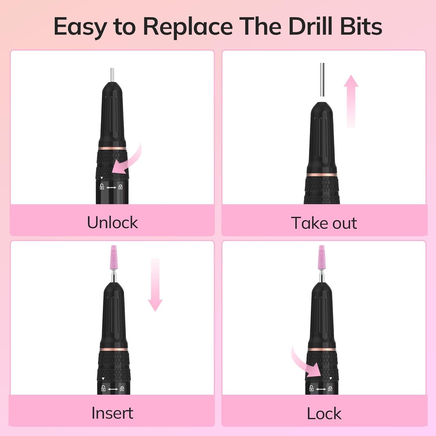 【Portable & Easy-use】Take your nail care routine on the go with Belle professional nail drill kit. Its lightweight and sleek design makes it easy to store in your bag, so you can touch up or fully manicure your nails no matter where you are. The unique pause button design allows for quick and efficient drill bits replacement. Perfect for a newbie or a pro
