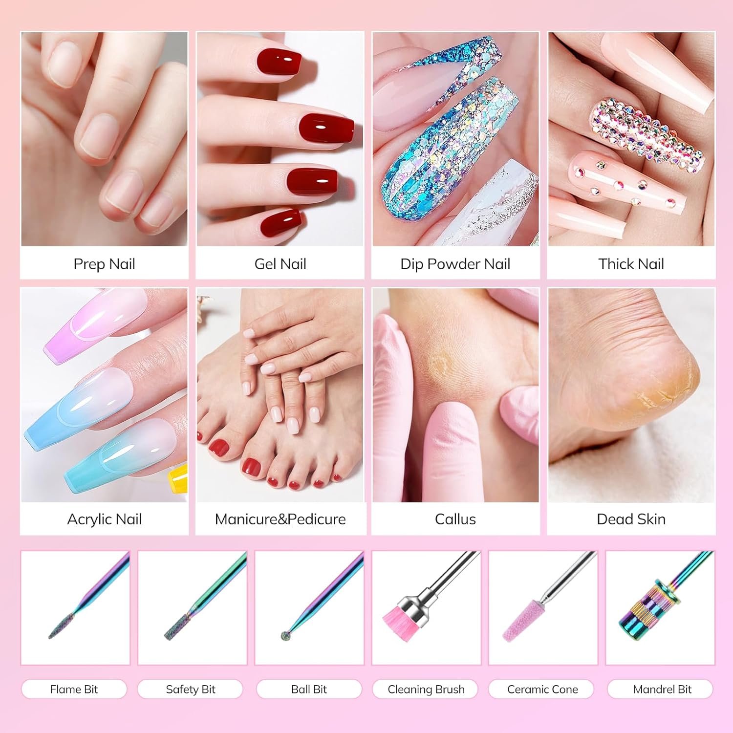 【Large LED Display Nail Drill】Belle professional nail drill support Pause /Forward/ Reverse direction, LED display can clearly show you the speed and the power status, easy control and use the electric nail file. With 6pcs nail drill bits, you can achieve carving, engraving, routing, grinding, sharpening, sanding, cutting, polishing, and drilling work
