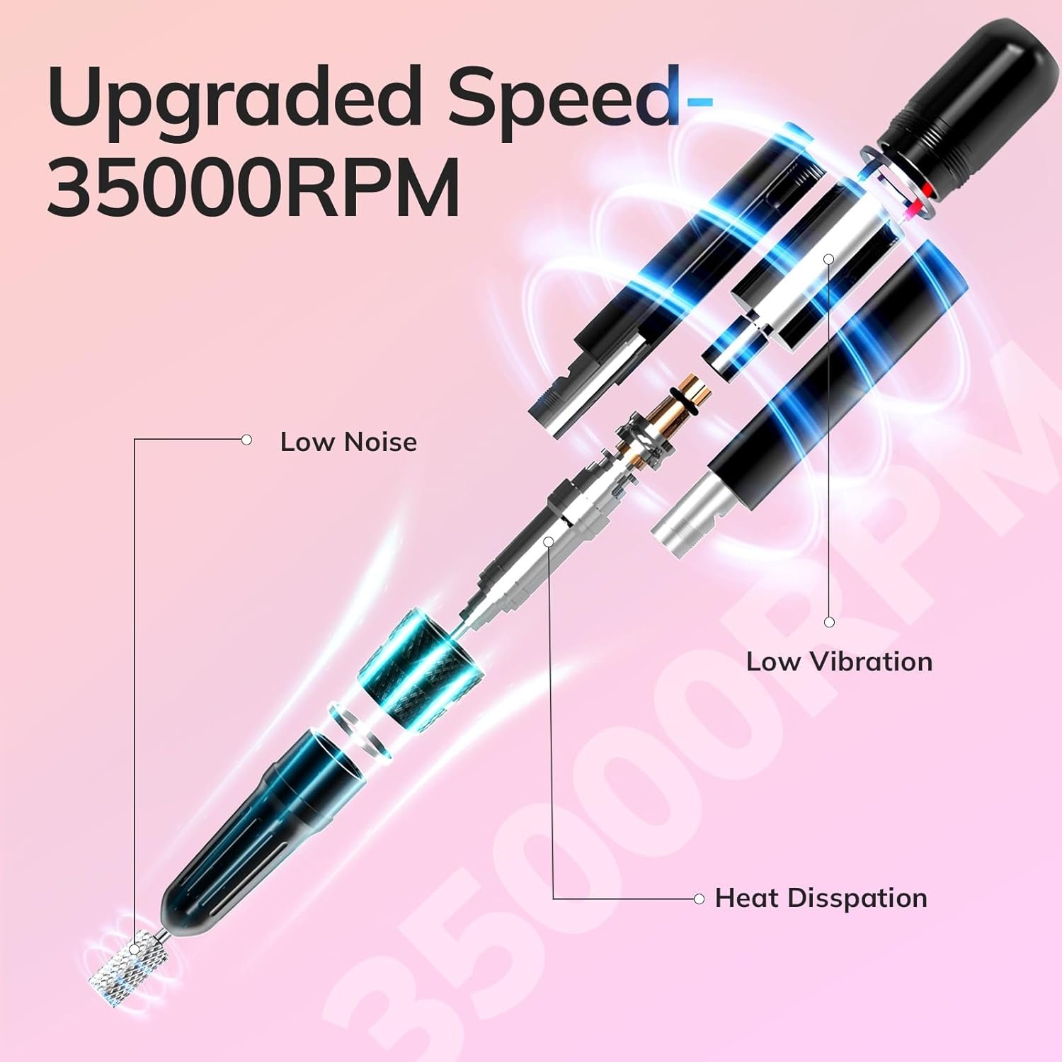【High-quality Coreless Motor】Belle nail drill professional is equipped with powerful coreless motor, delivering effective nail care every time. With low noise, low vibration, low heat treatment, its smooth operation ensures a comfortable experience, while its adjustable speed range of 0-35000RPM meets your unique needs
