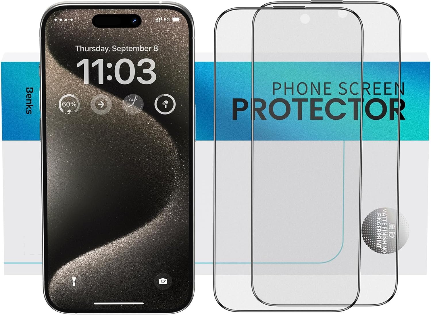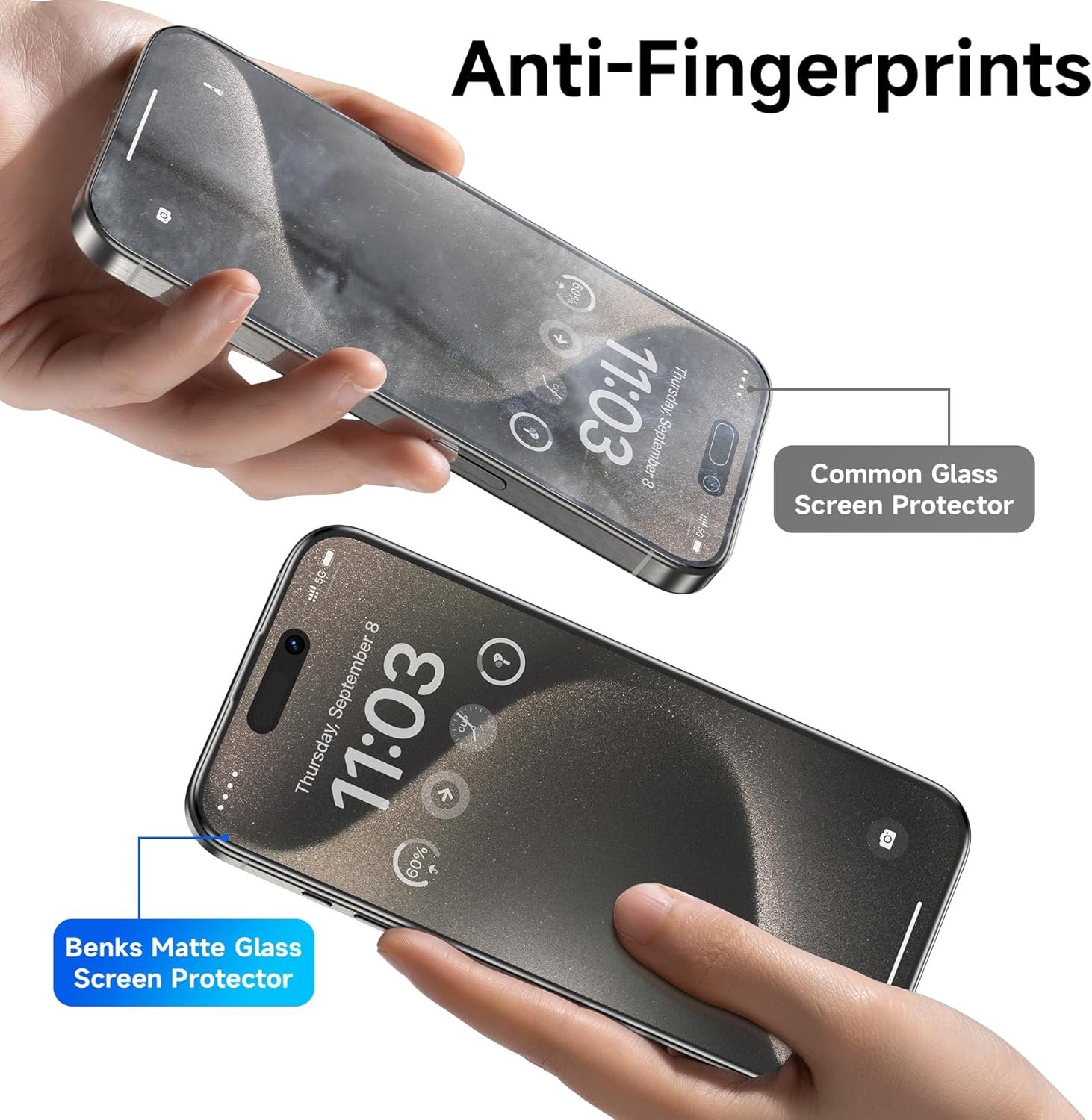 Glare protection:BENKS iPhone 15 Pro Max screen protector with a premium anti-glare matte finish that reduces harsh light reflections off your screen, making your phone easier to use under direct sunlight, or in brightly lit rooms