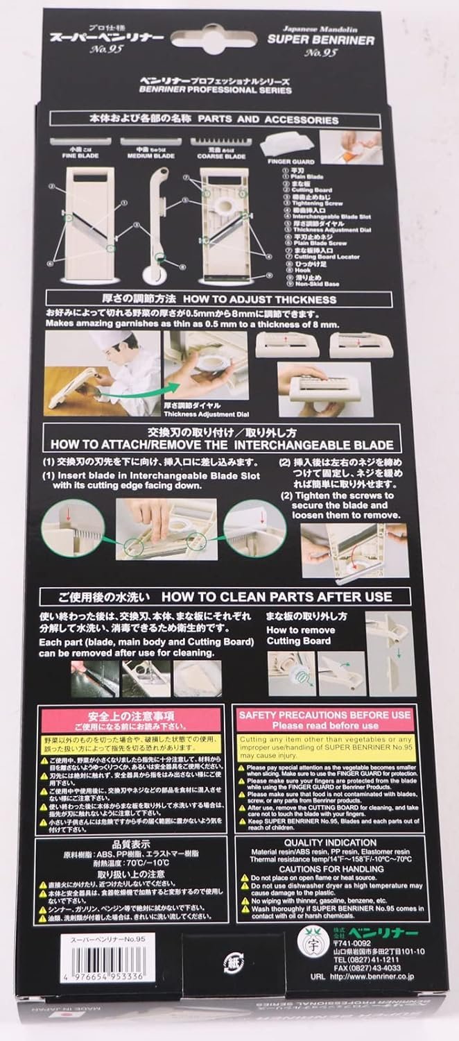 Benriner’s Beige mandolin quickly and easily slices medium fruits and veggies into consistently sized pieces that cook evenly and look great, just like the pros. It’s a favorite of kitchen tools for easier food preparation to save lots of time during food preparation. Create delicious, healthy entrees and side dishes, like stir fry’s, casseroles, or Vegetarian recipes, and prepare healthy Snacks or garnish, salad toppings, and so much more. Safe and easy to use. The safety guard holds smaller end pieces securely for less waste and to protect fingers. With 4 interchangeable cutting blades and an easy-turn dial to adjust slice thickness, it’s easy to make a variety of cuts to fit every recipe. Use the straight-edge blade to make wider slices for chips, scalloped potatoes or thinly sliced onion, The coarse-toothed blade for Chunky French fry cuts and carrot sticks, medium-toothed or fine-toothed blades to make long, narrow and extra-narrow strips, called julienne or matchstick cuts, for hashbrowns, shoestring potato nests, noodles (zucchini spaghetti strands) and stir fry’s the nonskid rubber base adds stability during use or securely hook the groove onto bowls to collect slices. Simply snap in the desired blade, hold the mandolin slicer by the handle and slice directly into a bowl or onto a work surface. Made from Handcrafted Japanese stainless steel blades and BPA-free plastic, Includes 4 interchangeable blades (straight edge, coarse-tooth, medium-tooth and fine-tooth), large open comfortable handle and nonskid rubber base. The safety guard holds smaller end pieces for safe-and-easy slicing and protects fingers. Disassembles for easy cleaning. Top-rack dishwasher safe for easy cleanup.