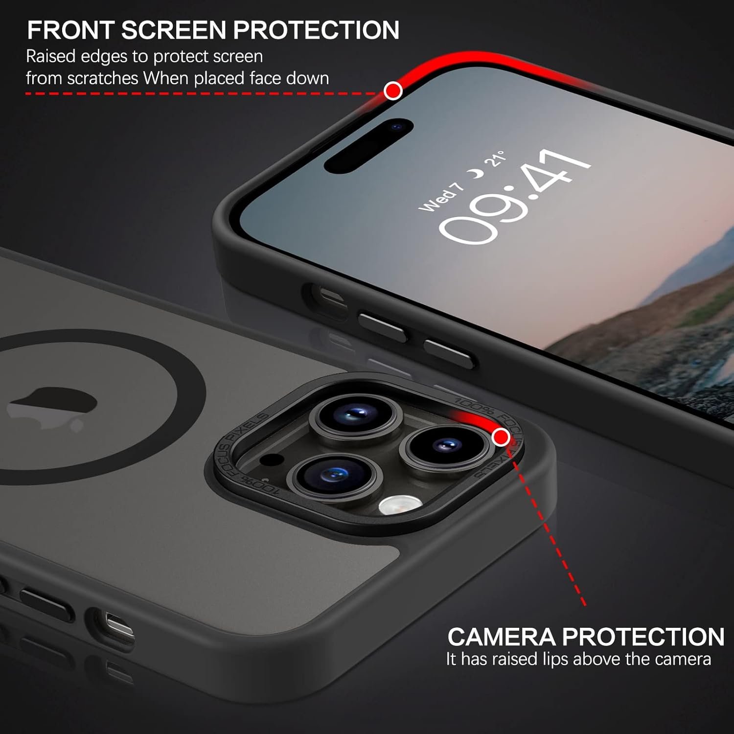 【Compatible with MagSafe Accessories】 This iPhone 14 Pro Phone Case, with a built-in magnetic ring that aligns perfectly with MagSafe chargers and other Qi-certified chargers, offers a strong attach experience and faster wireless charging. This iPhone 14 Pro Case can be firmly attached to all MagSafe accessories like MagSafe charger, wallet, battery pack, car mount. However, it can’t stick to metal surfaces like fridges, steel, etc.