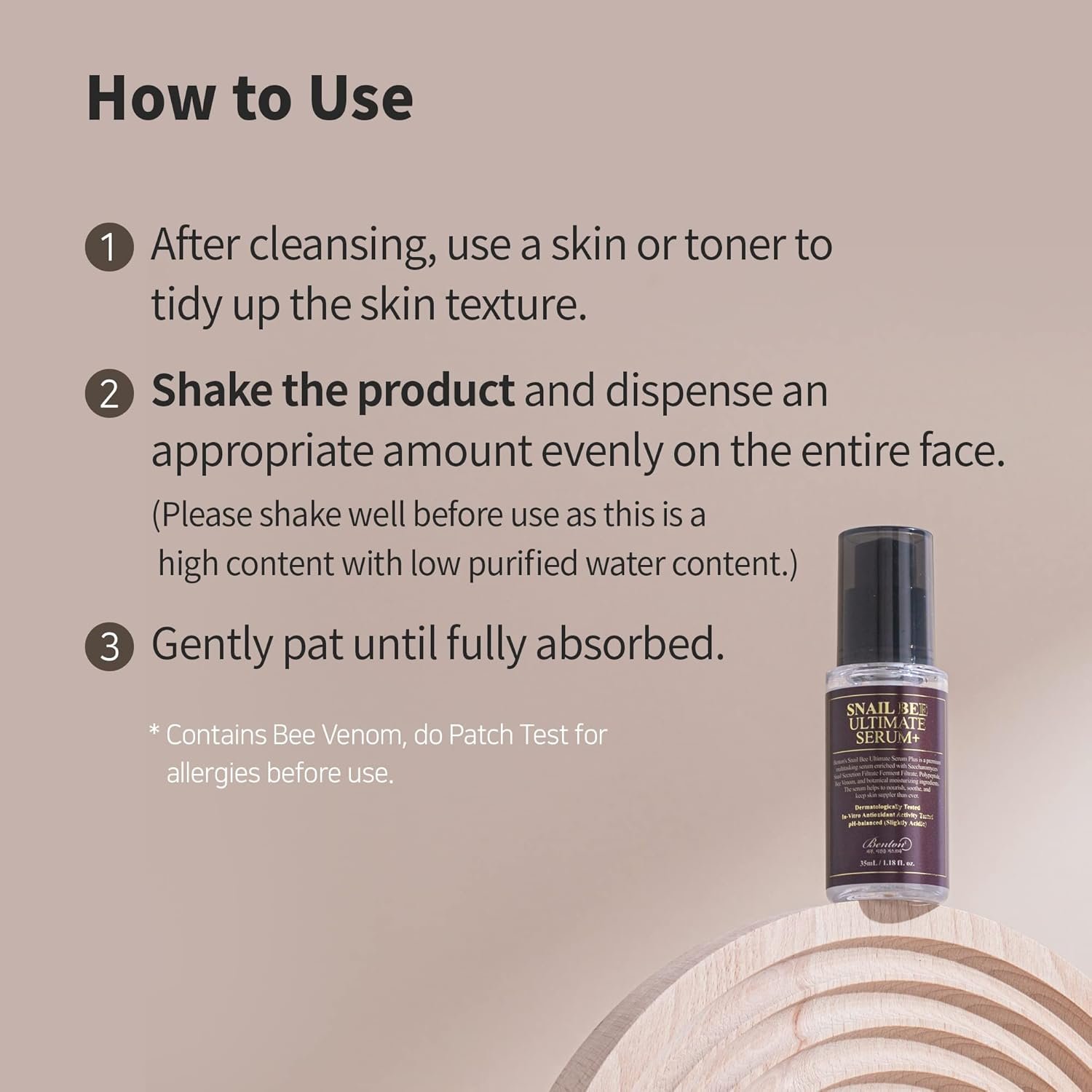 [PRE-PURCHASE CHECKLIST] 1) No artificial fragrances added; slight natural scent possible. 2) Yellowish tint from peptides, not artificial color. 3) Contains Bee Venom, do Patch Test for allergies before use.