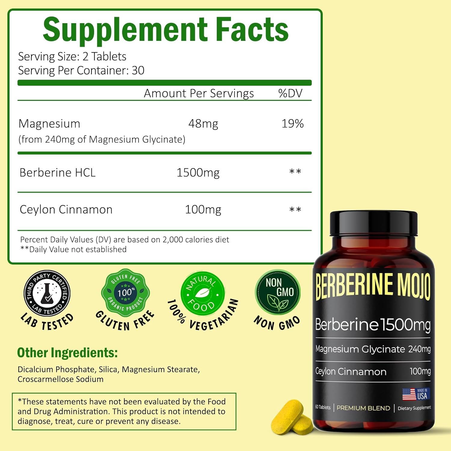 INTRODUCING BERBERINE MOJO: Experience the power of Berberine Mojo delivering 1500mg of Berberine HCL, 240mg of Magnesium Glycinate, and 100mg of Ceylon Cinnamon in every serving. Our berberine tablets are easy-to-swallow and allow you to reach your fitness goals naturally.