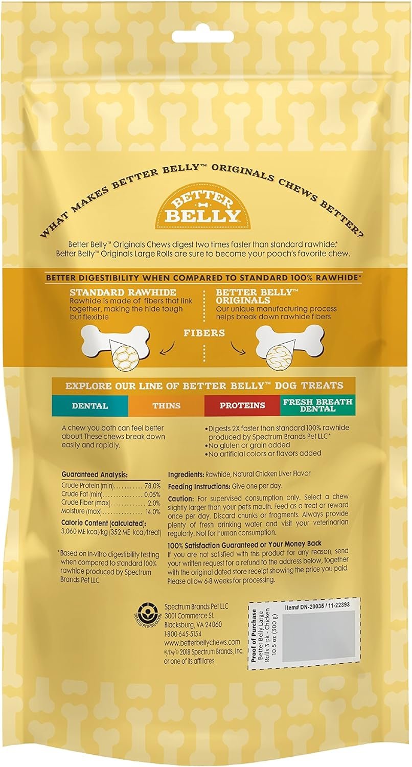 Better Belly brand offers a variety of highly digestible chews for your dog. Our unique manufacturing process helps break down Rawhide fibers so your pup can digest them faster. With no gluten, grains, artificial colors or artificial flavors added, you can treat your dog to a chew you both feel good about.Better Belly Originals natural chicken liver flavor large rolls digest two times faster than standard Rawhide.*  FREE of fillers, binders and artificial colors and flavors, These chews are sure to become your pooch’s favorite new treat. Standard Rawhide is made of fibers that link together, making the hide tough but flexible. Our unique manufacturing process breaks down Rawhide fibers for highly digestible Rawhide. Better Belly Originals natural chicken liver flavor large rolls provide pups with chicken liver flavor they love while satisfying their natural instinct to chew. Give your dog up to one Better Belly chew per day as a treat or reward.Explore the complete line of Better Belly dog treats, including dental, thins, proteins and fresh breath Dental.*Based on in-vitro digestibility testing when compared to standard 100% Rawhide produced by Spectrum brands pet LLC.
