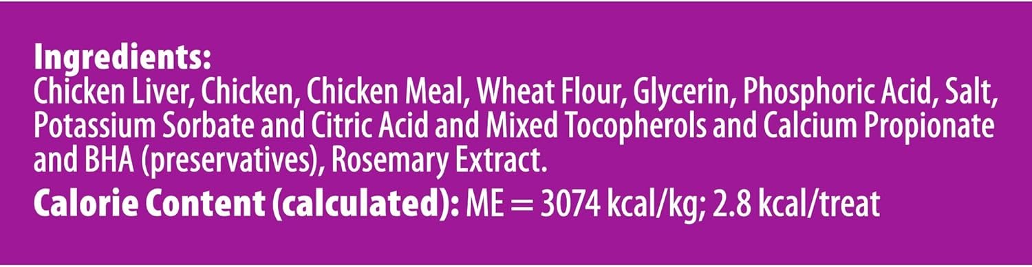 INGREDIENTS: Chicken Liver, Chicken, Chicken Meal, Wheat Flour, Glycerin, Phosphoric Acid, Salt, Potassium Sorbate and Citric Acid and Mixed Tocopherols and Calcium Propionate and BHA (preservatives), Rosemary Extract