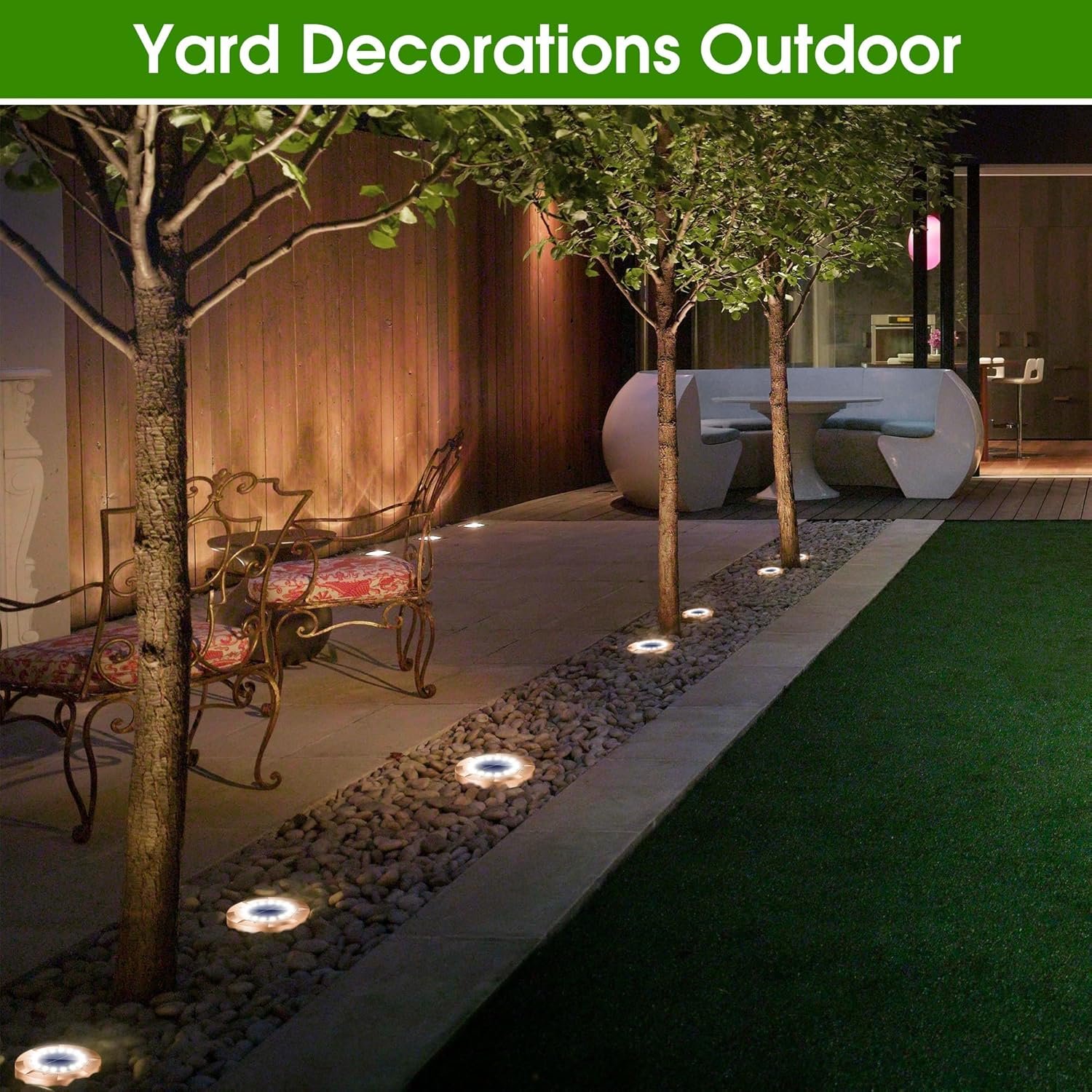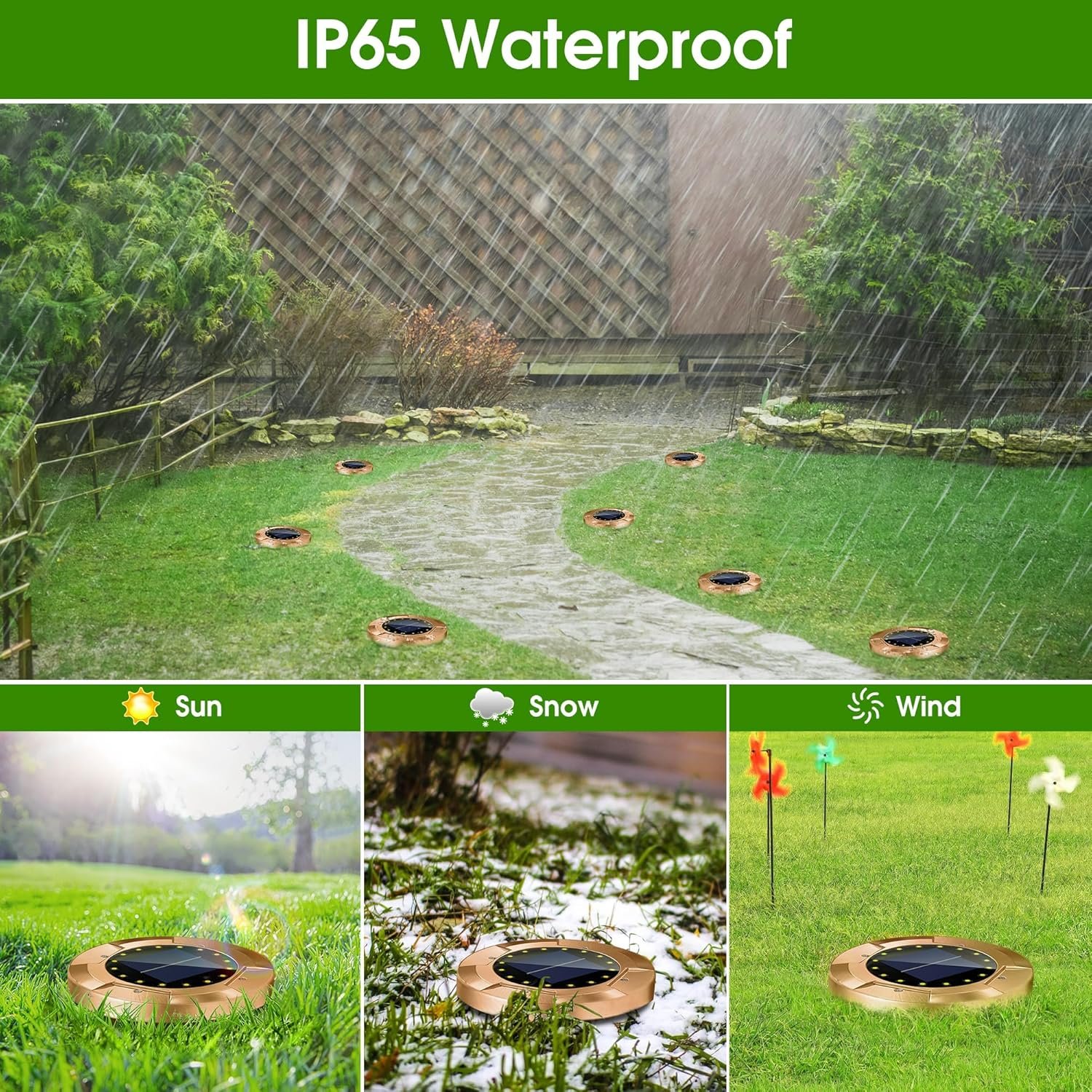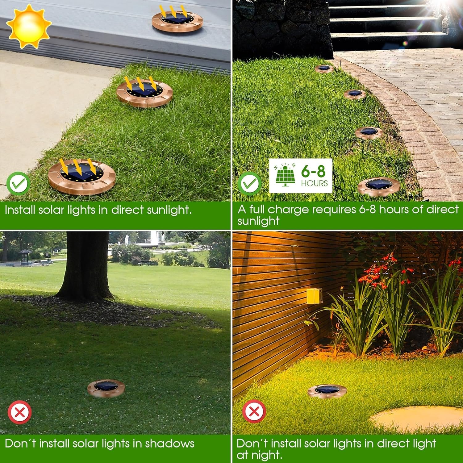 Longevity Solar Powered Outdoor Lights: We use larger areas of solar panels to convert solar energy, so although charging and work time will change depending on the weather, each solar disk light typically illuminates for 8-10 hours after 4-6 hours of charging. We also seal the electronic components to make them have a longer service life. Our solar lights will brighten your yard longer