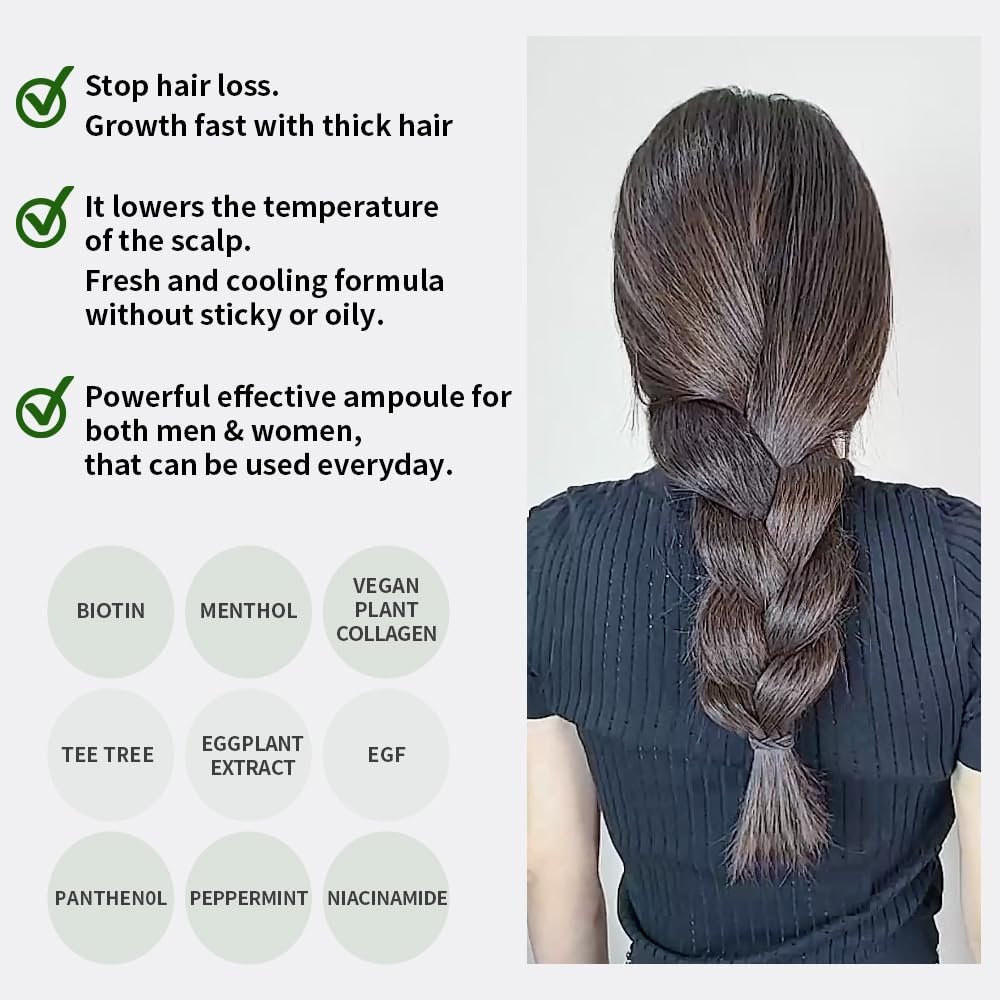 COOLING DOWN SCALP TEMPERATURE : Menthol, peppermint, and Korea eggplant extracts reduce the temperature of the scalp and make the sagging hair roots small, giving tension and preventing hair loss. When the temperature of the scalp increases, the hair roots open easily, resulting in hair loss.