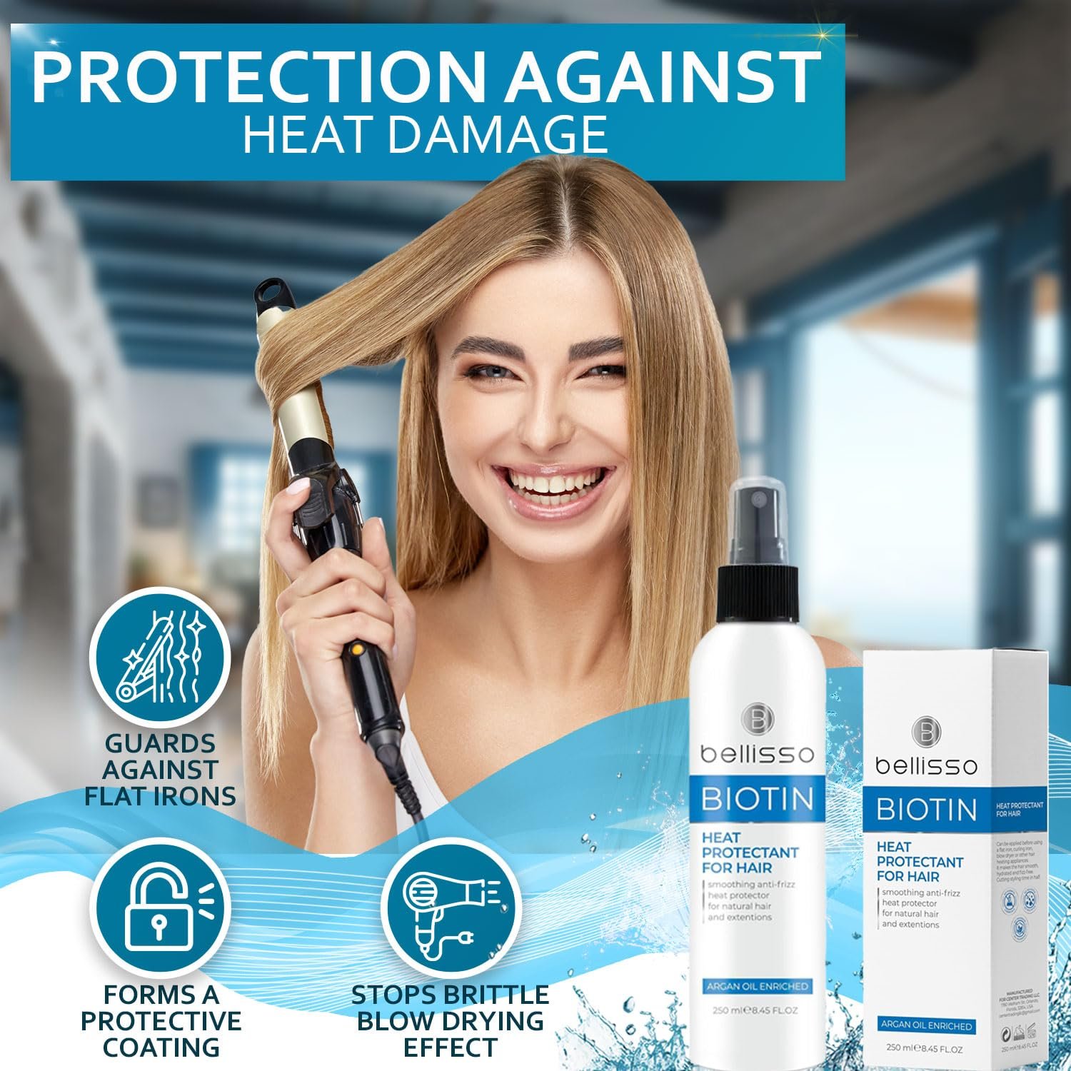HEAT DAMAGE PROTECTION: This premium heat protection spray for hair is crafted to guard against damage from blow drying and flat irons. Our biotin and Moroccan oil heat protectant spray forms a protective coating around each strand. When you need a blow dry and flat iron spray that actually works, trust only Bellisso’s advanced biotin spray.