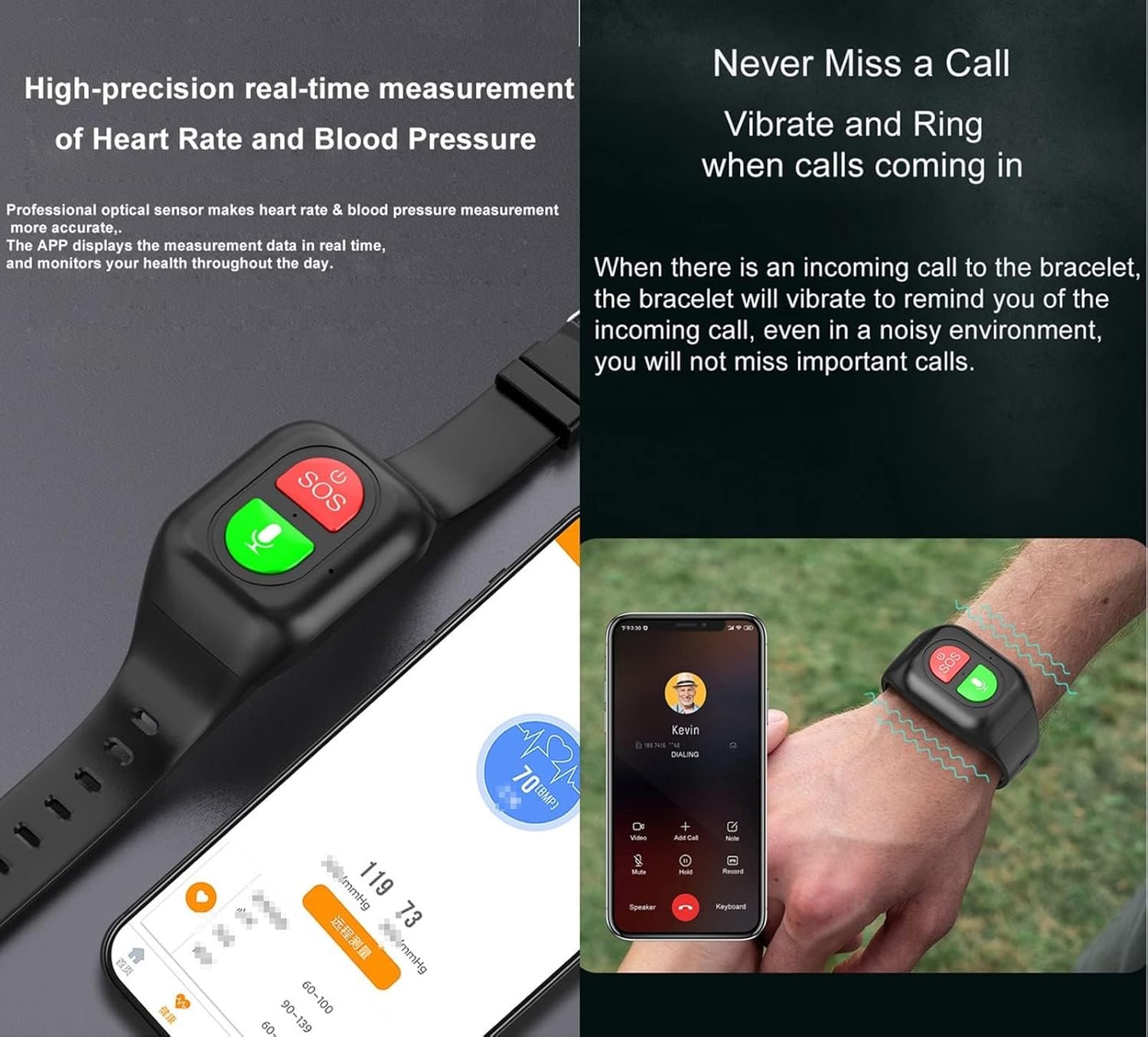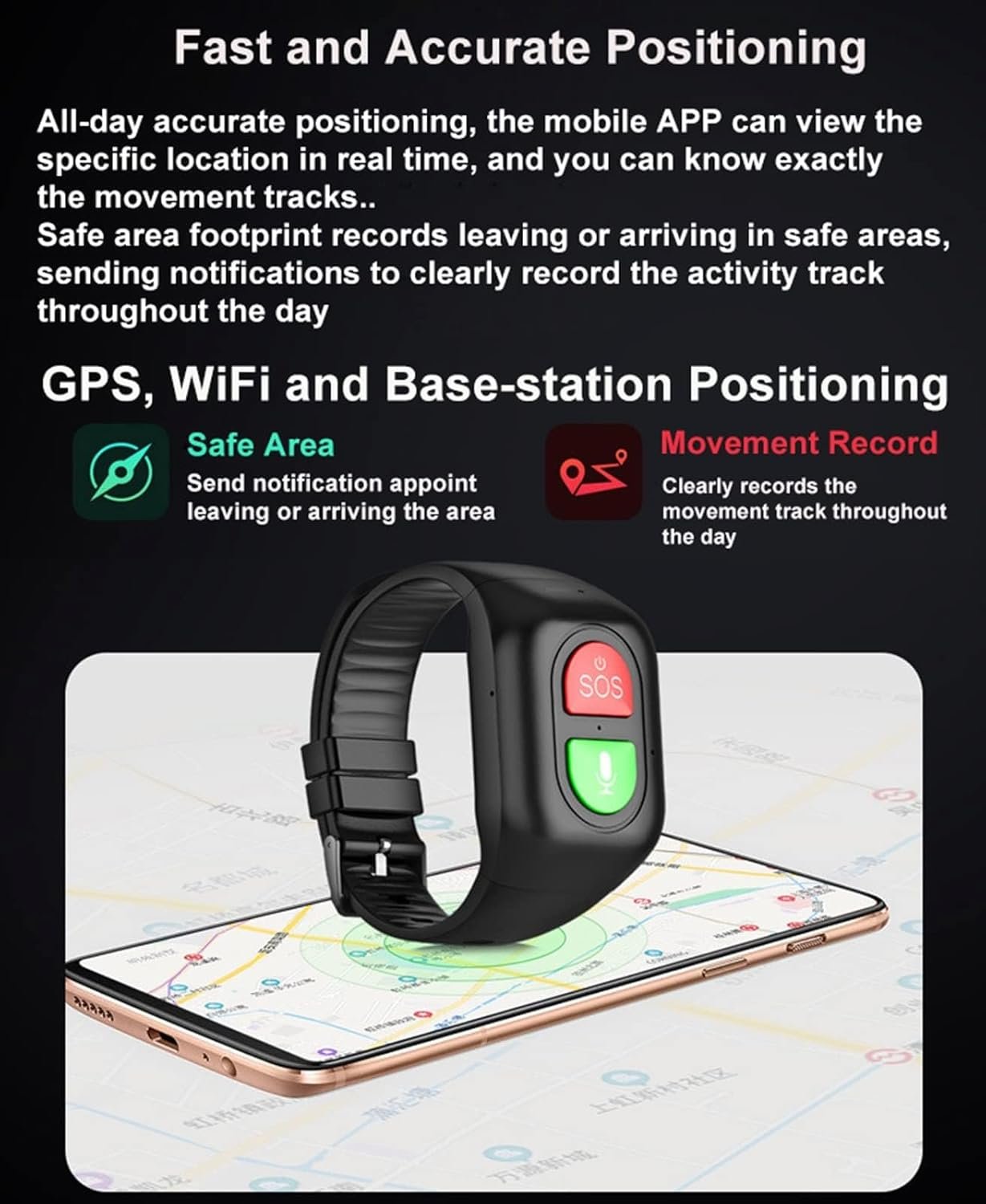 Function: IPX7 waterproof, SOS one-key for help, health pedometer, electronic fence, fall alarm, incoming call vibration reminder, activity track, one-key voice time announcement