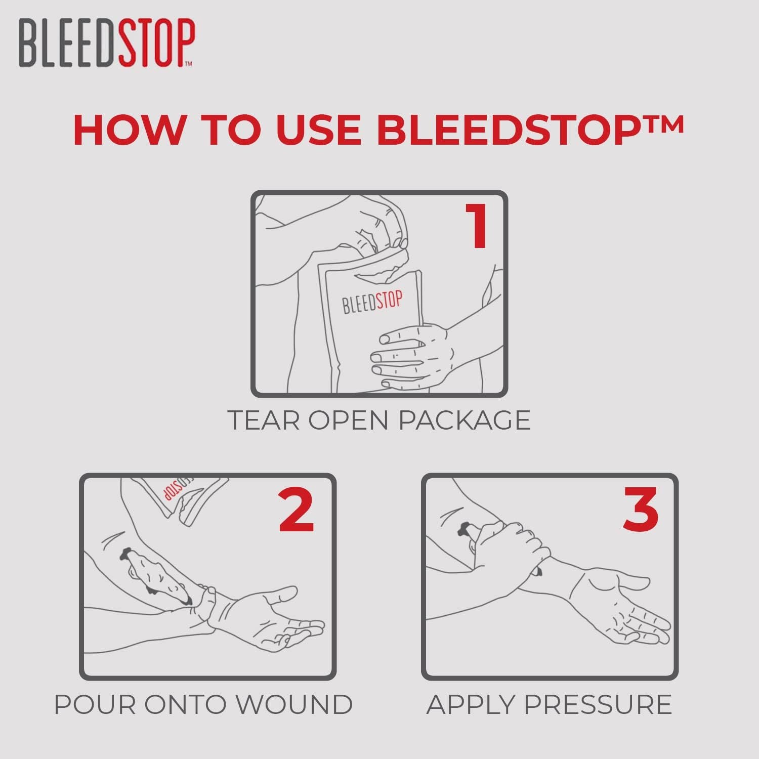 HOW TO USE: Simply pour a layer thick enough to cover the entire surface of the wound/laceration before applying firm pressure over the bleeding site using sterile gauze or bandage; BleedStop powder is safe on to leave it on the wound, so it’s not necessary to wash it off before bandaging; Please seek emergency medical treatment if bleeding doesn’t stop after a prolonged period of time