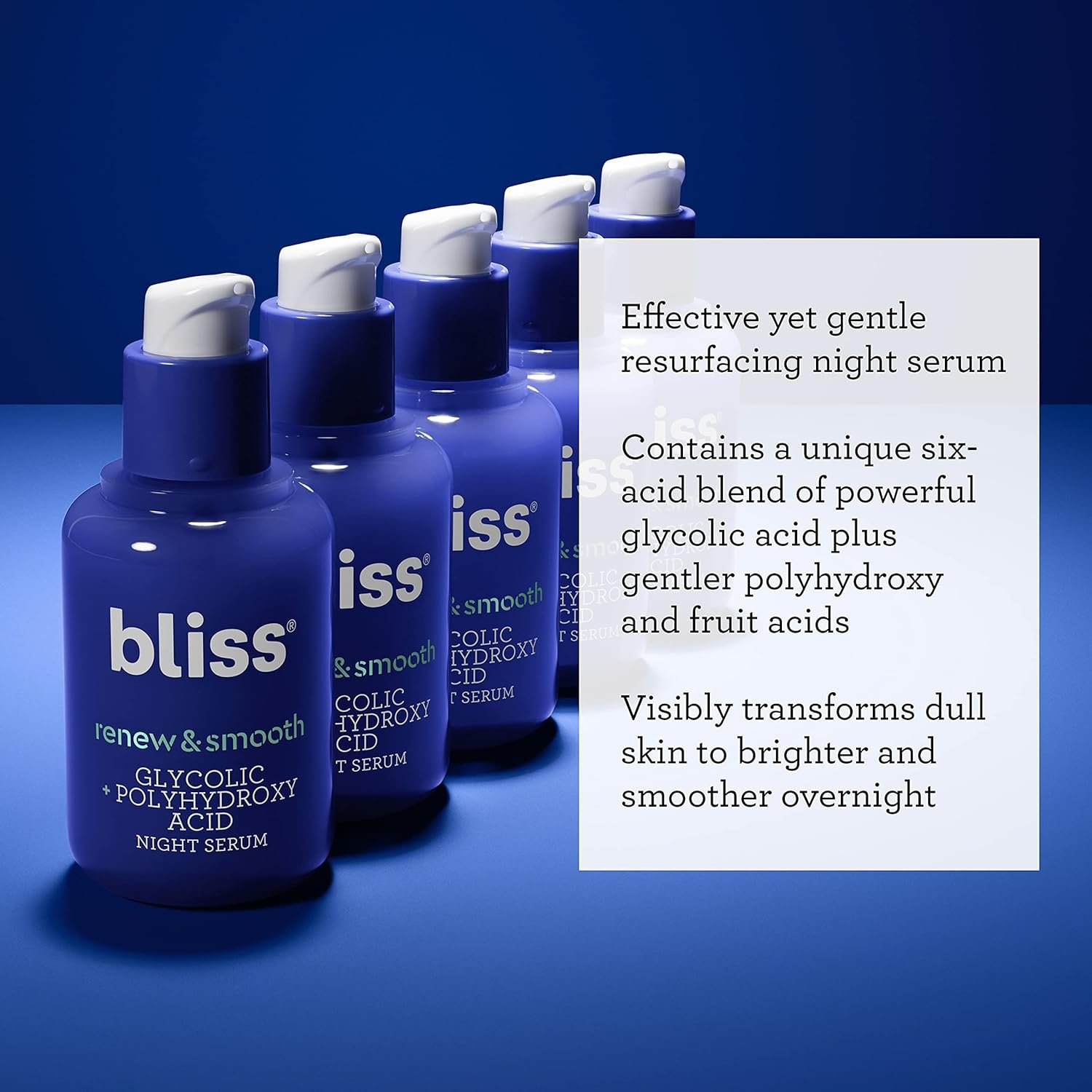 RENEW AND SMOOTH GLYCOLIC + POLYYHYDROXY ACID NIGHT SERUM: Wake up to smoother, more refined skin overnight with Bliss’ nightly PM serum. The floral jasmine scent makes it a rich and soothing part of your nightly skincare routine.