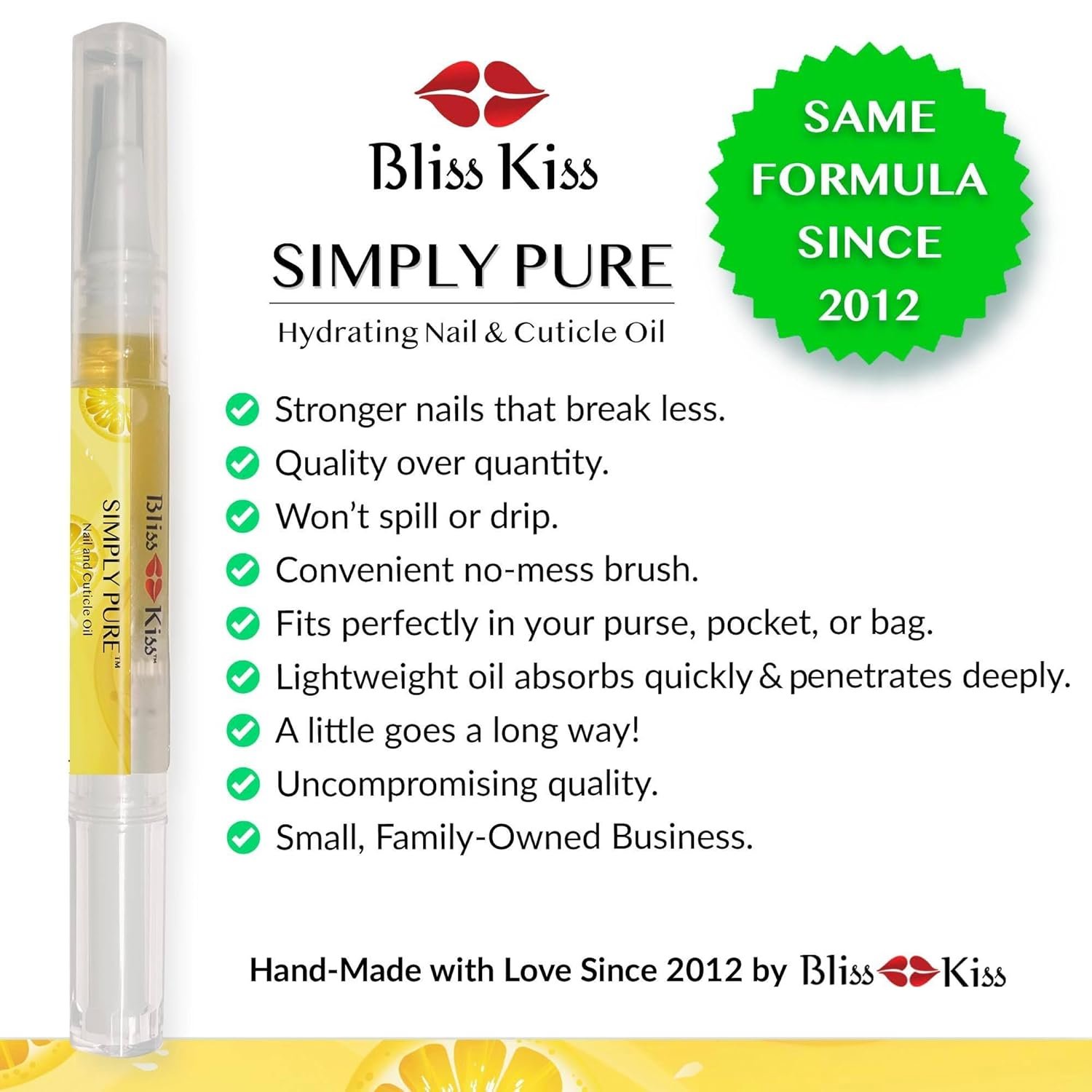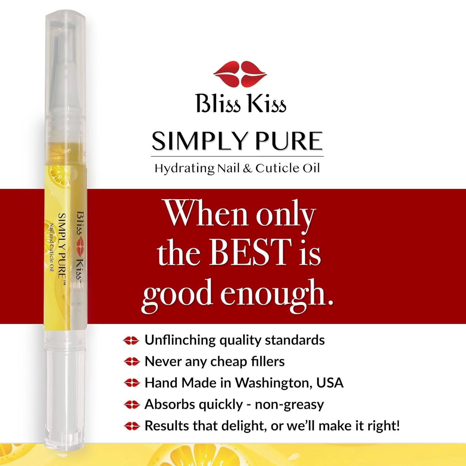 Feeling Hopeless? If you’ve tried other nail strengtheners and nail growth treatments and been disappointed, you’ve finally come to the right place. Bliss Kiss nail and cuticle oil is hand-made with love and backed by nail science. No water. No dyes. No parabens. No preservatives. No mineral oil. No gluten. No almond oil. No fillers. No kidding. Each Simply Pure nail oil cuticle pen is hand-made with love in the USA since 2012. Remember, Bliss Kiss is best for instant relief & lasting success.