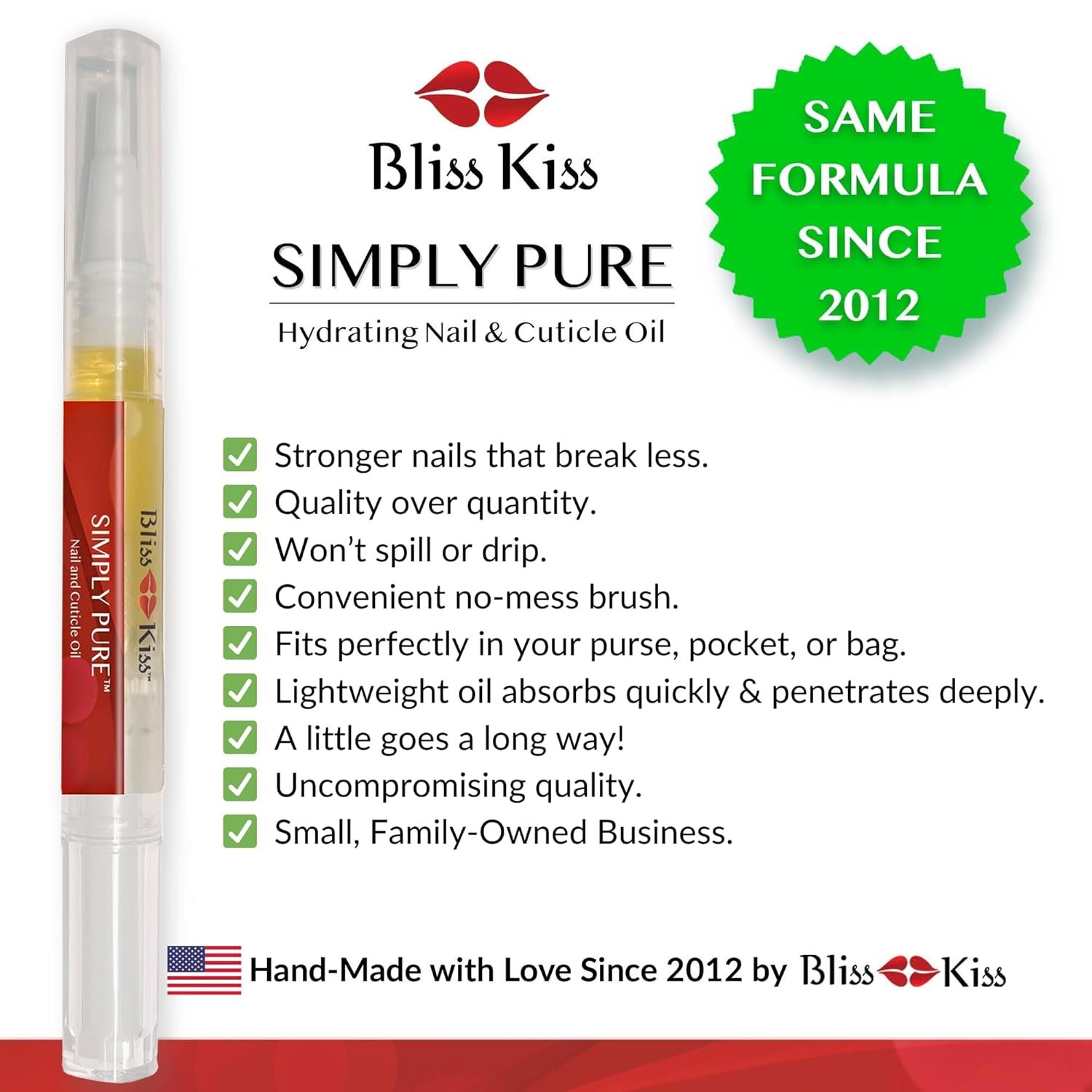 Feeling Hopeless? If you’ve tried other nail strengtheners and nail growth treatments and been disappointed, you’ve finally come to the right place. Bliss Kiss nail and cuticle oil is hand-made with love and backed by nail science. No water. No dyes. No parabens. No preservatives. No mineral oil. No gluten. No almond oil. No fillers. No kidding. Each Simply Pure nail oil cuticle pen is hand-made with love in the USA since 2012. Remember, Bliss Kiss is best for instant relief & lasting success.