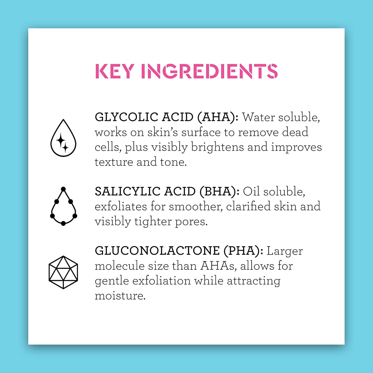 EFFECTIVE & PROFESSIONAL SPA-GRADE NGREDIENTS: A perfectly balanced blend of 11.8% chemical exfoliators includes Glycolic Acid AHA to help visibly brighten and smooth uneven texture, Salicylic Acid BHA to help clarify skin and minimize the look of pores, and Gluconolactone PHA to gently exfoliate while promoting intense moisture.