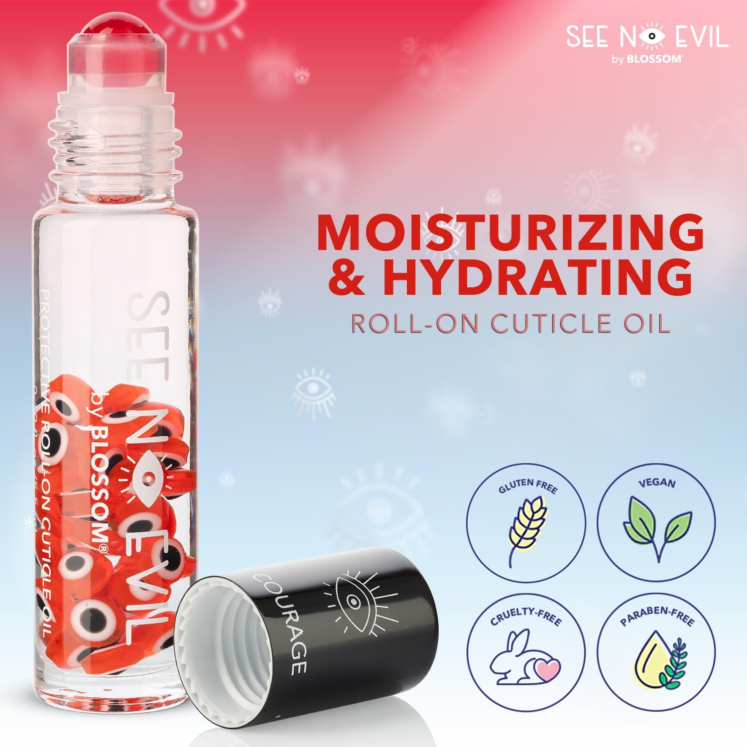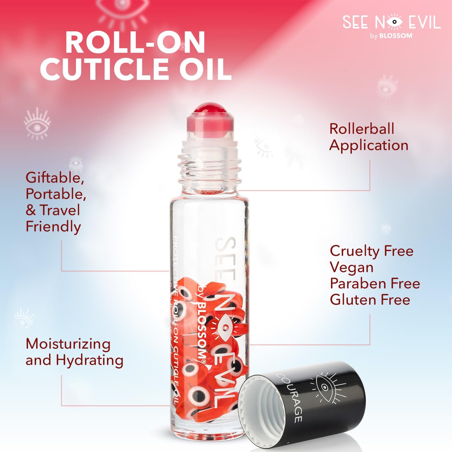 ROLL-ON CUTICLE OIL: Blossom’s See No Evil Roll On Cuticle Oil is available in 4 positivity-inspired scents (Courage Rose, Intelligence Jasmine, Happiness Lily, and Ambitious Lavender) with matching colored evil eye charms