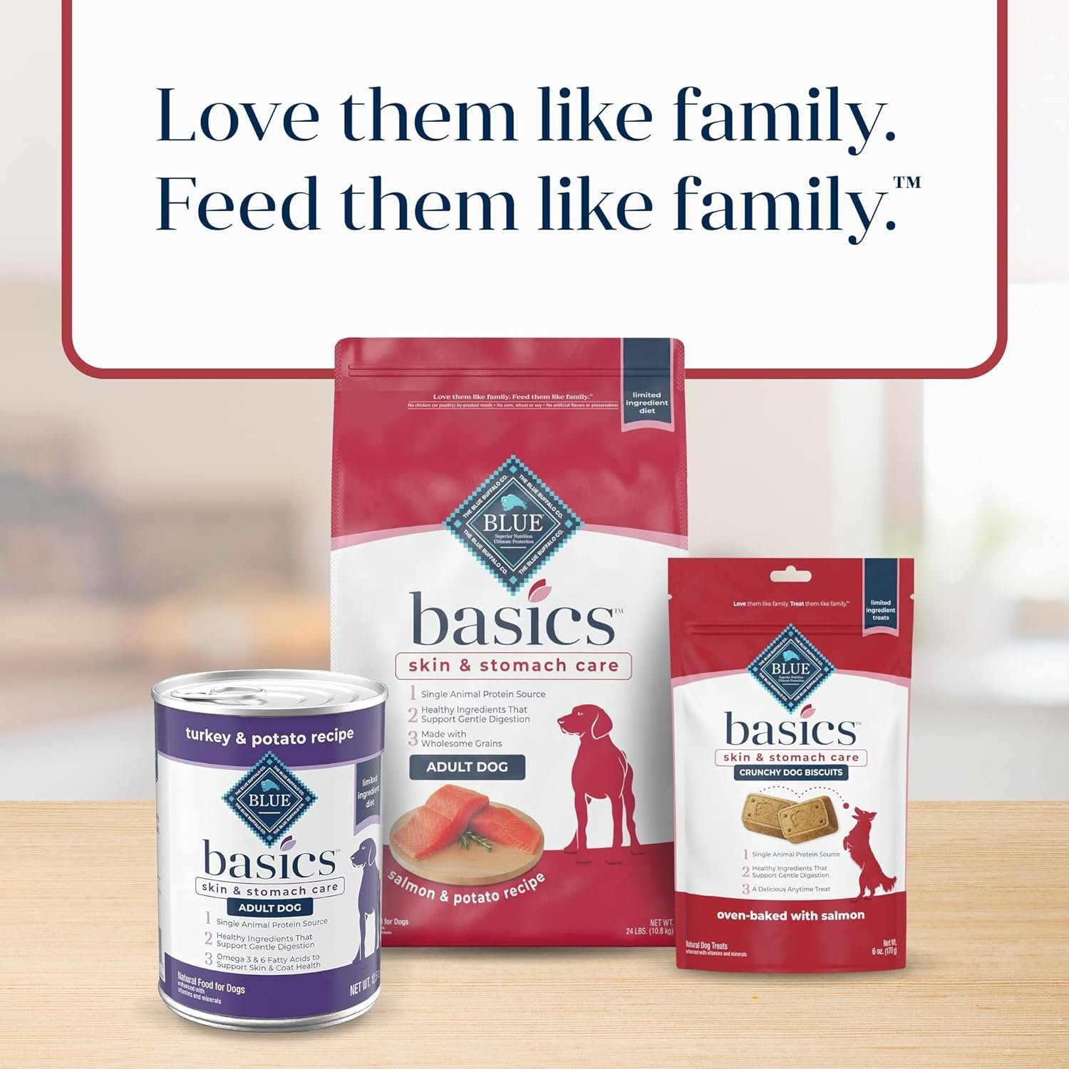 Contains: One (1) 6-oz. bag of BLUE Basics Skin & Stomach Care Crunchy Dog Biscuits, Salmon & Potato Recipe