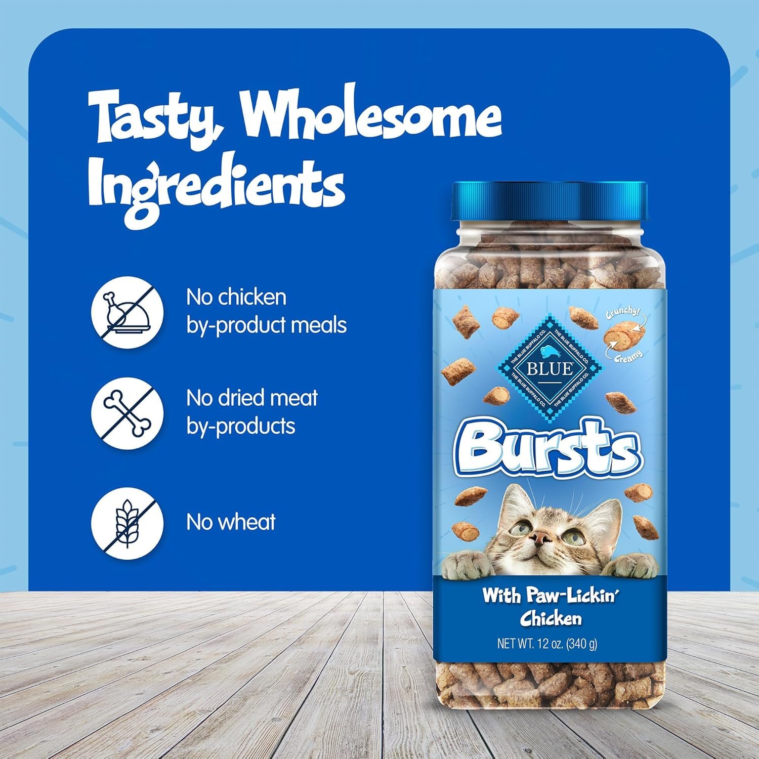 Contains One (1) 12-oz. tub of BLUE Bursts Crunchy & Creamy Cat Treats With Paw-Lickin’ Chicken