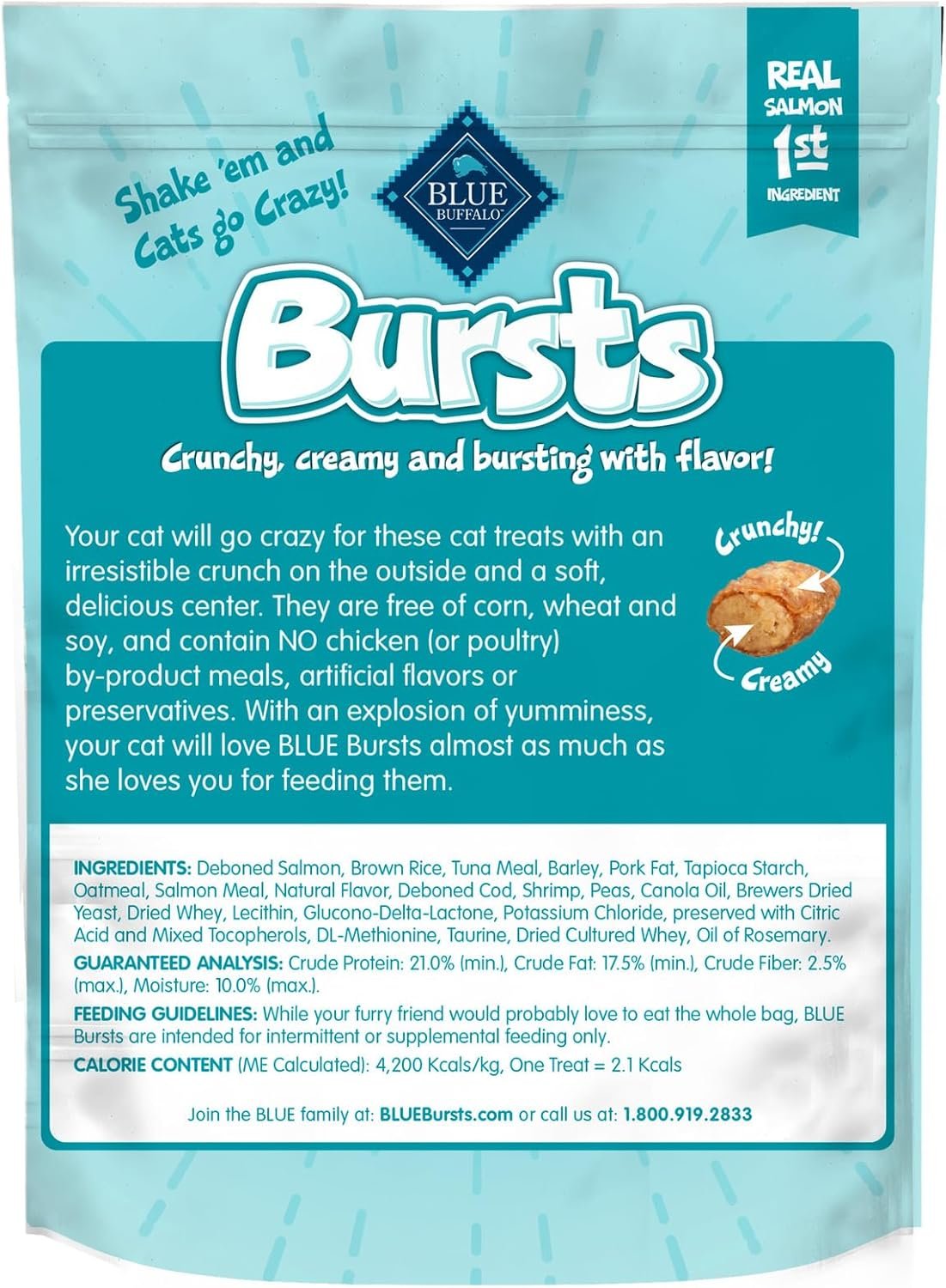 Treat your feline friend to an explosion of flavor and texture with BLUE Bursts. With a crunchy outer shell and a creamy center of mouthwatering seafood, these deliriously delicious cat treats are made to keep your kitty purring for more – just shake the bag and cats come running! And with real salmon first and NO poultry by-product meals, these cat treats feature the ingredients you’ll feel good about giving.