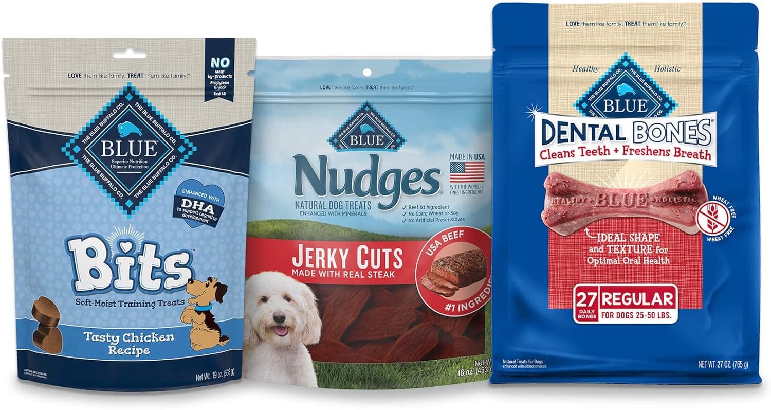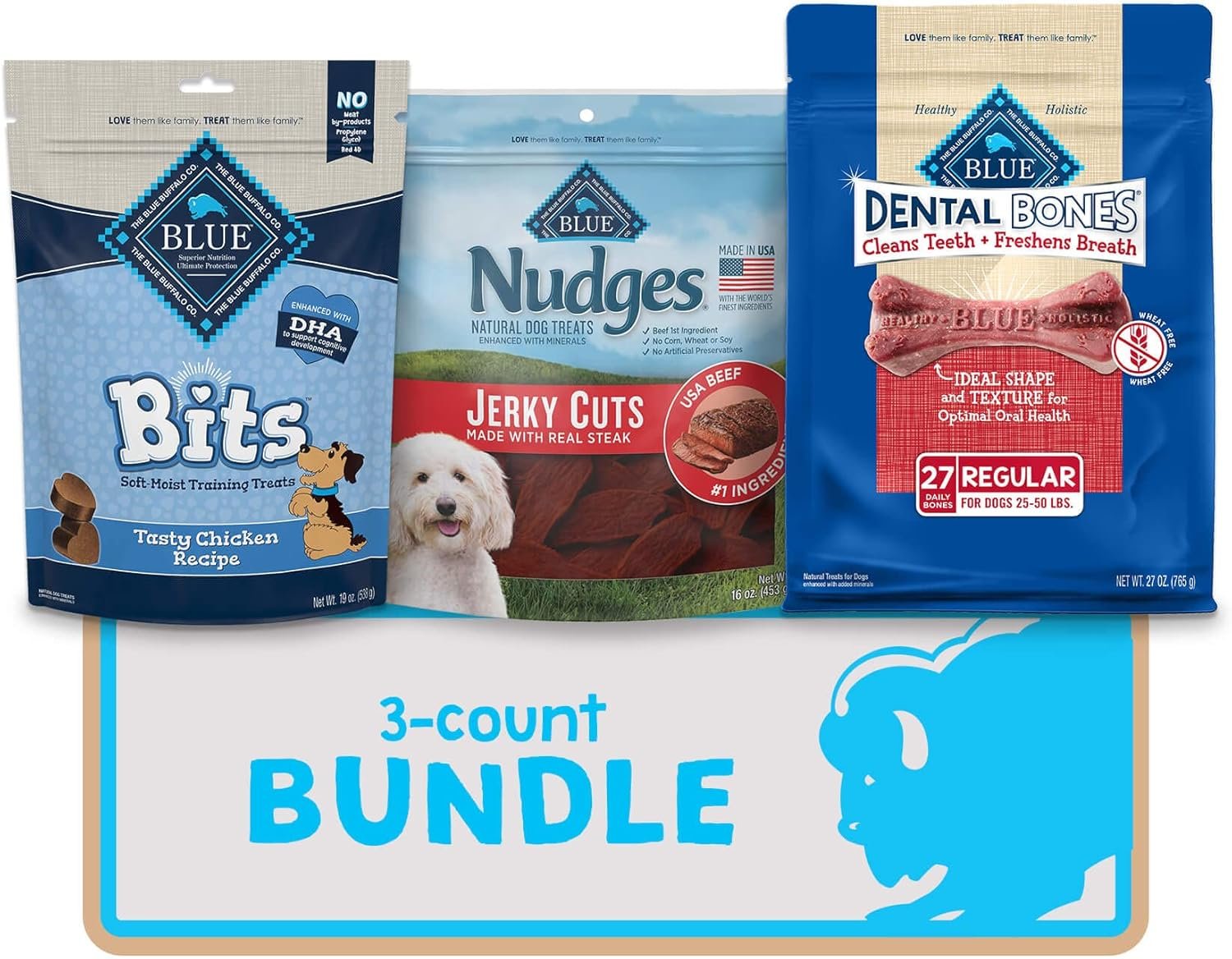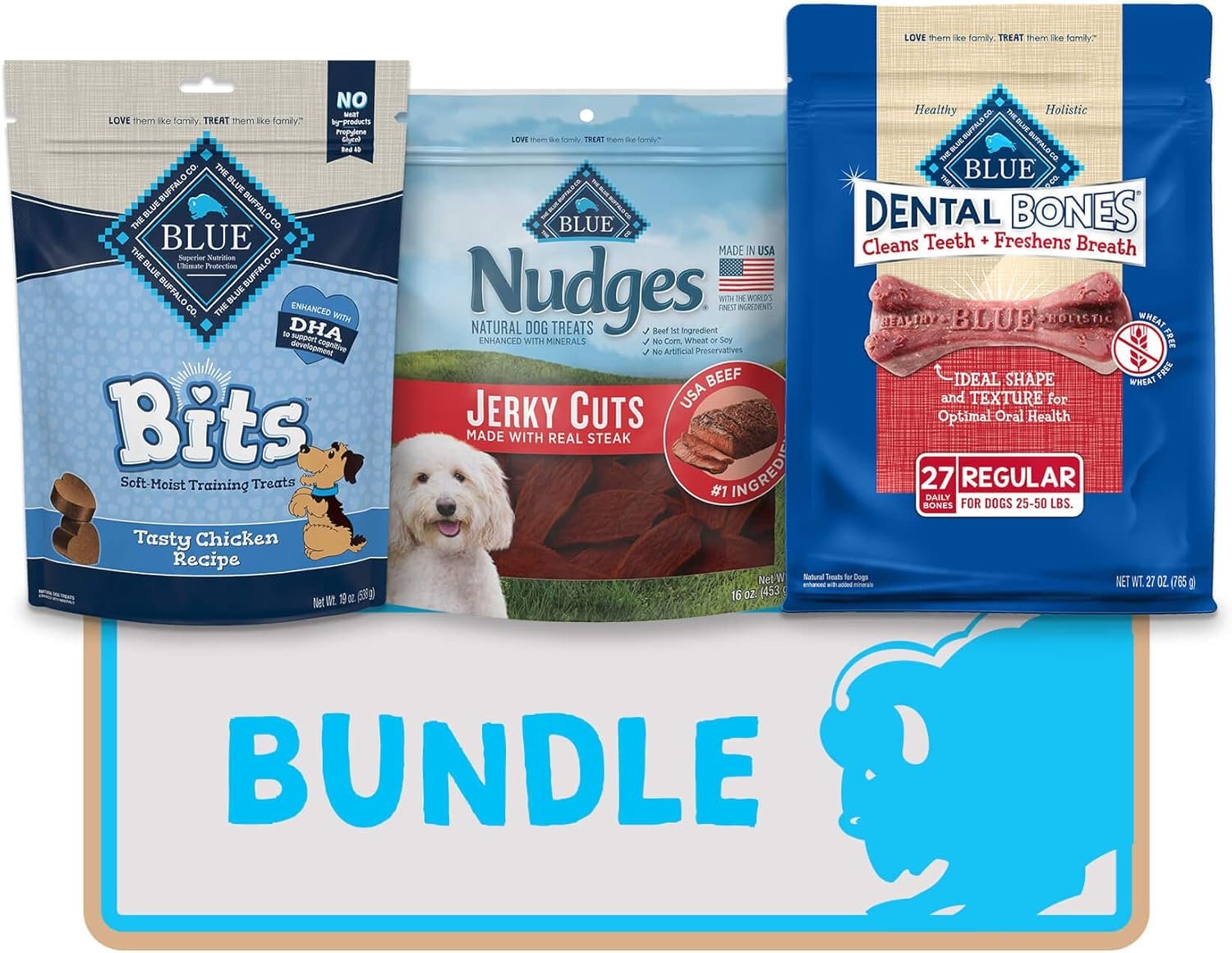 The Blue Buffalo Dog Treats Variety Bundle includes a dental chew bundle with dental bones, blue nudges jerky cuts, blue bits training treats, and blue nudges beef and chicken flavored treats. The dental bones help clean teeth and freshen breath while maintaining healthy teeth and gums. They are made without chicken by-product meals, corn, wheat or soy. The nudges jerky cuts use real steak as the first ingredient for a mouthwatering taste. The bits training treats use delicious real chicken as the first ingredient, making them an ideal reward for good behavior. The meaty training treats are tender, bite-sized morsels perfect for training small, medium or large dog breeds. They contain DHA to support cognitive development. The bundle comes in a bag with a variety of treats to satisfy your dog’s dental and nutritional needs.