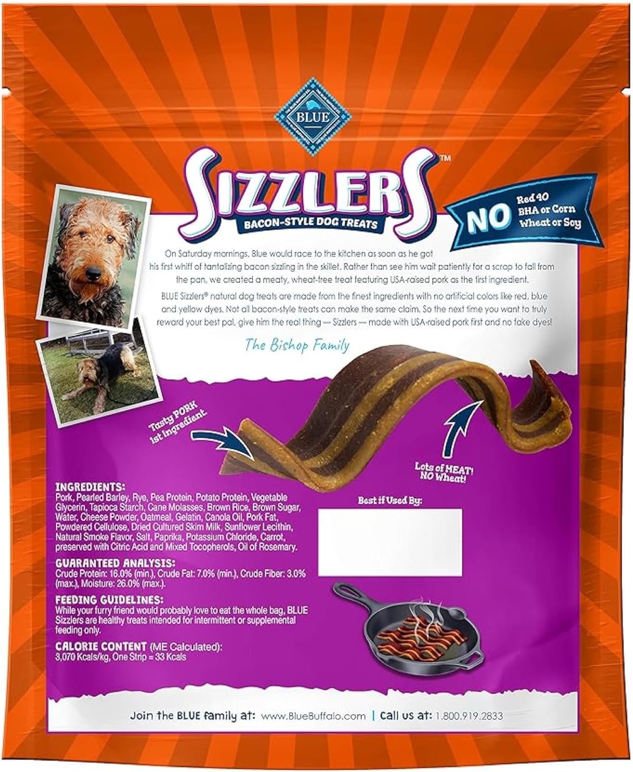 Contains: One (1) 6-oz. bags of BLUE Sizzlers Bacon-Style Soft-Moist Dog Treats, Pork Recipe.