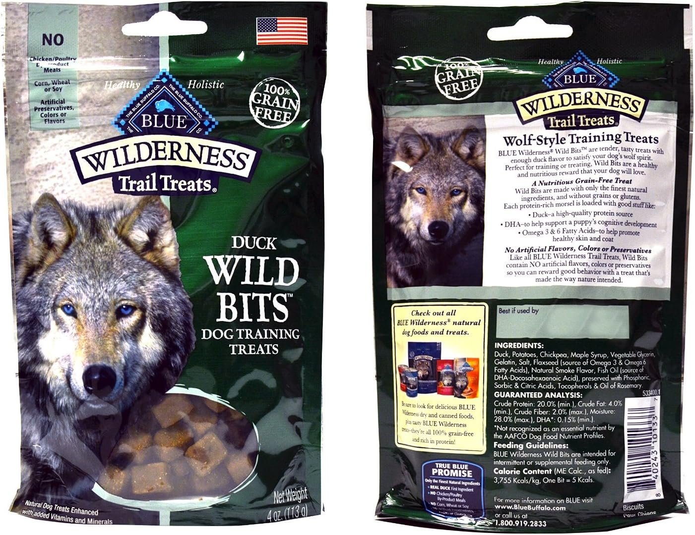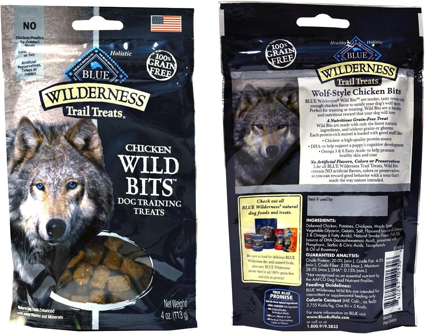 BLUE Wilderness Trail Treats Chicken Wild Bits Grain-Free Dog Training Treats A perfect complement to the Wilderness foods, BLUE Wild Bits treats are packed with more of the real chicken your dog loves. A healthy, nutritious treat that features real meat, these meaty Bits are the perfect way to reward your four-legged friends. Nutritious and grain-free, BLUE Wild Bits contain only the finest natural ingredients and are loaded with healthy ingredients like: Chicken–a high-quality protein source DHA–to help support a puppy’s cognitive development Omega 3 & 6 Fatty Acids–to help promote healthy skin and coat BLUE Wild Bits contain NO artificial flavors, colors or preservatives so you can reward good behavior with a treat that’s made the way nature intended.