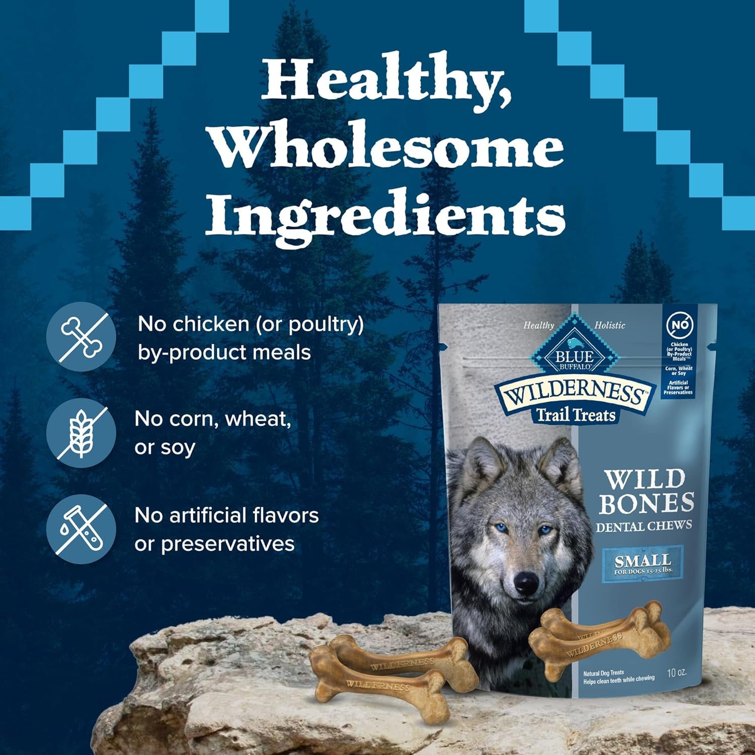 Contains: One (1) 10-oz. bag of BLUE Wilderness Trail Treats Wild Bones Small Dental Chew Dog Treats