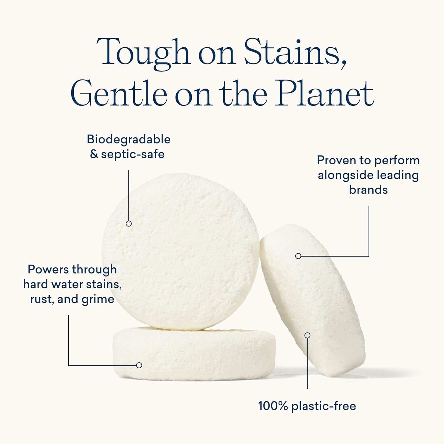 CLEAN INGREDIENTS. Plant and mineral-based tablet is 100% bio-based, biodegradable and septic-safe. Made without chlorine bleach, hydrochloric acid, no CTAC, no dyes, plastic-free. EPA Safer Choice, Leaping Bunny Cruelty-Free, Vegan, B Corp Certified, Climate Neutral, USDA Bio-Preferred.