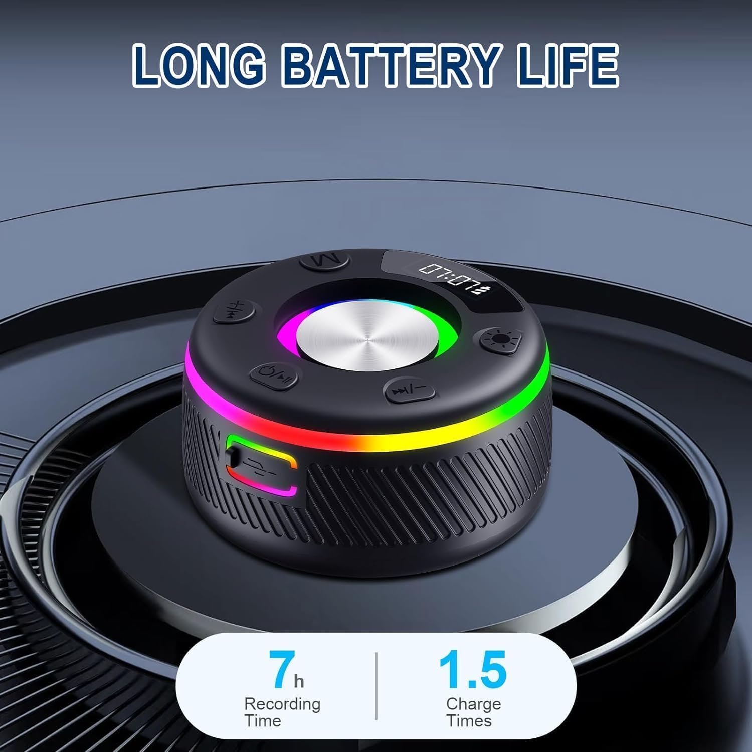 Colorful LED Light Show: Forget the hassle of frequent charging. Our portable speaker’s battery life is nothing short of impressive, providing up to 8 hours of playtime. The integrated LED lights offer a variety of colors and can be set to seven different lighting effects, creating an ambiance that complements the music and enhances your mood.