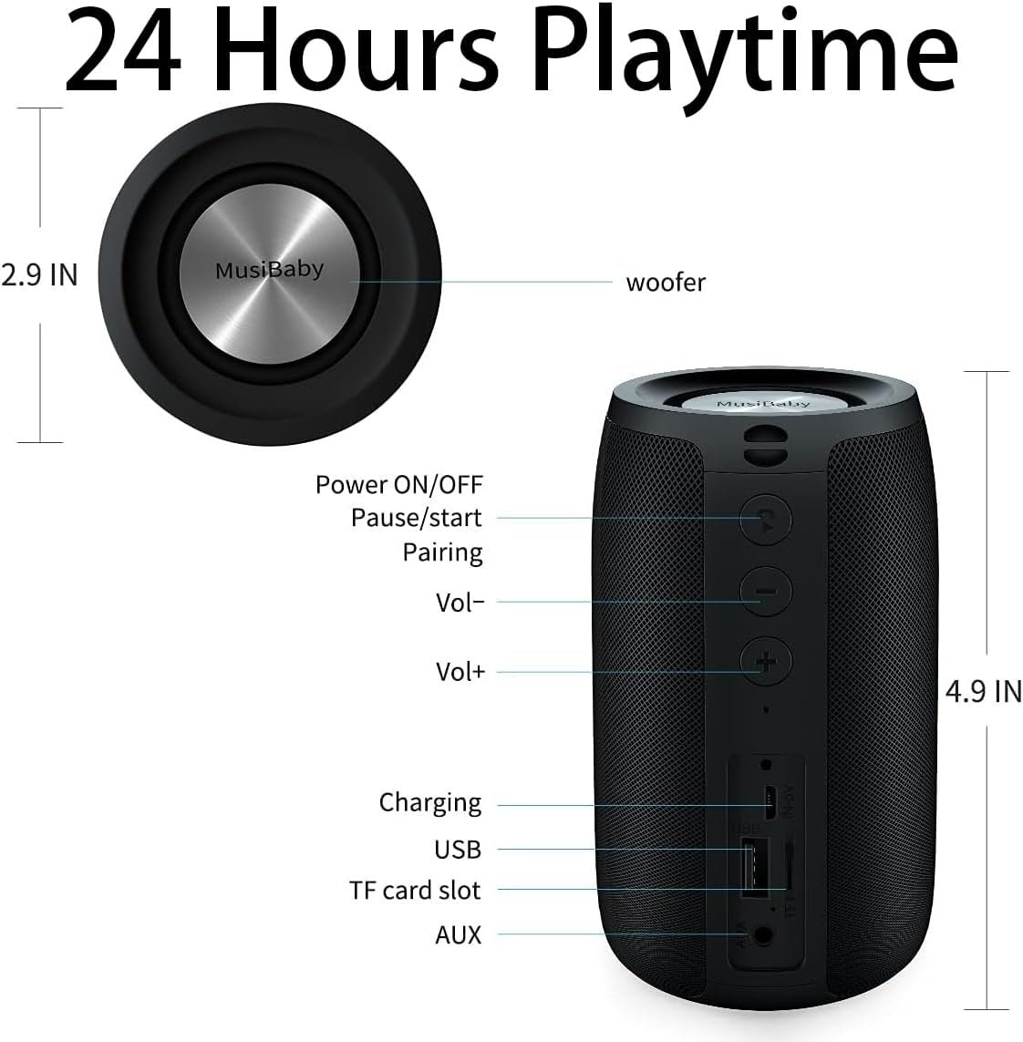 LONG BATTERY LIFE and PORTABLE BLUETOOTH SPEAKER.Musibaby Bluetooth Speaker comes with a Type-C charging cable and can be charged via USB, allowing you to charge it using a portable charger or power bank when an outlet is not available.It charges quickly and the charge lasts a long time.The playback time is up to 24H.The size of this speaker only 4.9*2.9 inch, light weight and portable. This wireless speaker is your ultimate portable Sound Companion! It’s also ideal electronic gadgets and Birthday Gift!Special info:The seller just update its charging function and battery capacity.The one you are buying now even with more excellent charging speed,battery life and charging fuction