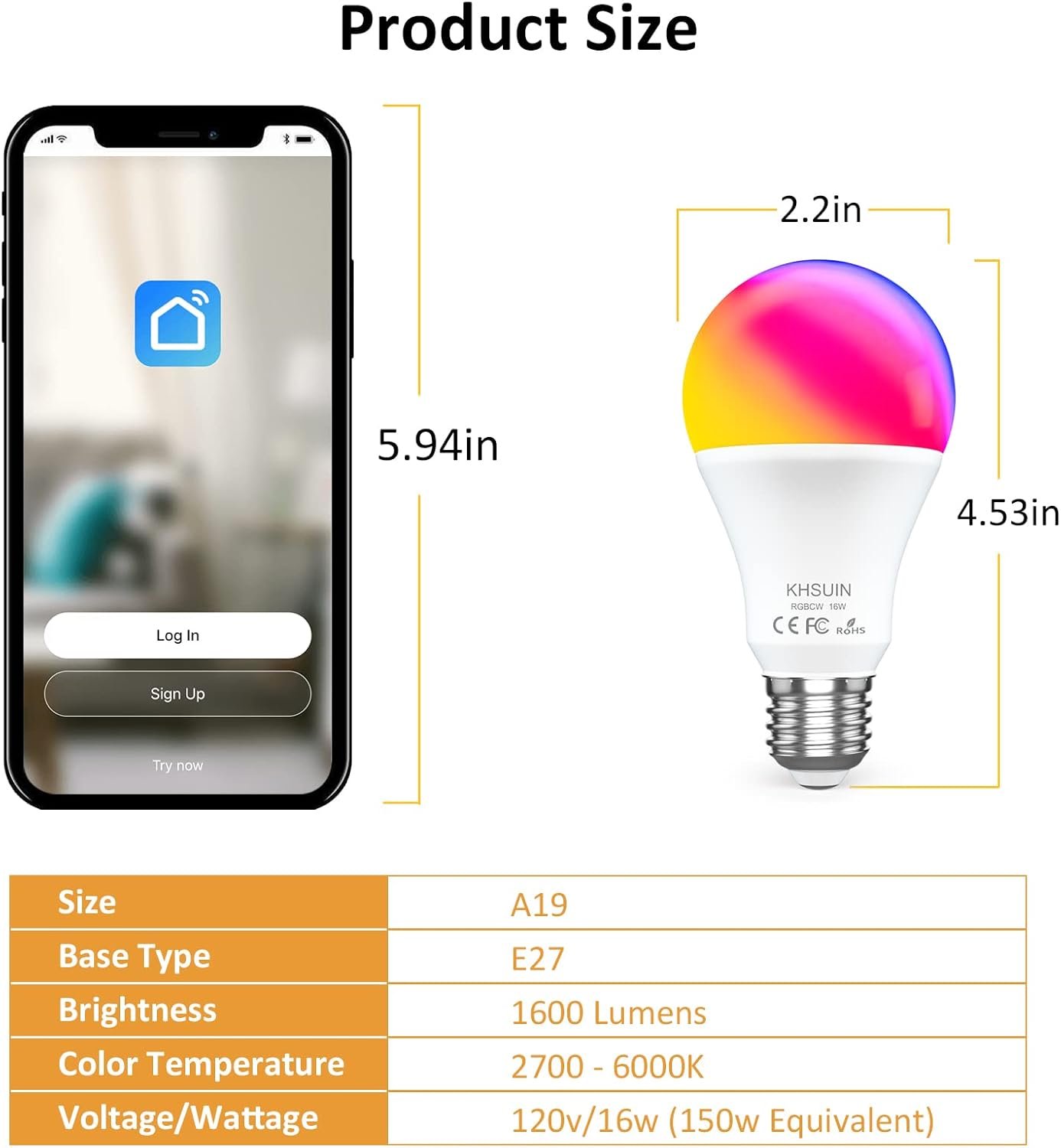 [Upgraded Ultra Bright Smart Light Bulbs] High lumen smart led bulb: 16W, 1600lm, 150W Equivalent. Upgraded scheme design of KHSUIN smart light bulb enhances light performance for family and workplace with higher wattage, lumen and better energy saving. Compared with normal smart bulb default of 7w, 9w, 10w and 12w, all users could install KHSUIN A19 16W smart bulbs in a higher place regardless of descending brightness caused by ascending height.