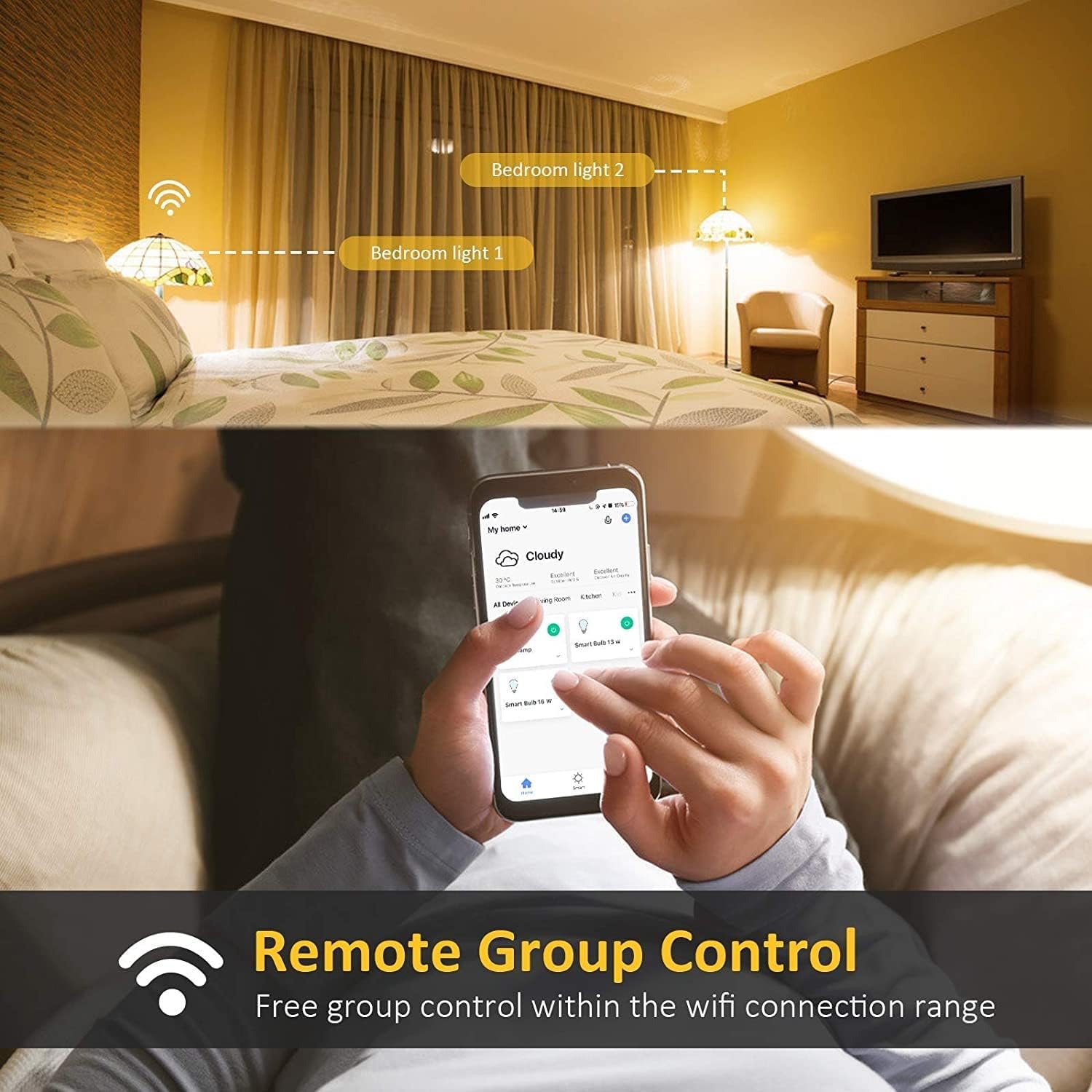[5 Control Modes] Integrated with 5 basic control modes: 1) Remote control: control smart bulbs anywhere with Wi-Fi alive. 2) App control. 3) Voice control: command light by voice. E.g: Alexa, turn on smart bulbs in living room. 4) Individual/group control: individually or in groups modify settings of different functions of smart bulbs. E.g: Of one bulb or more, convert the switch, change colors, dim brightness, or tune saturability. 5) Control smart bulbs via Alexa, Google home assistant, Echo.