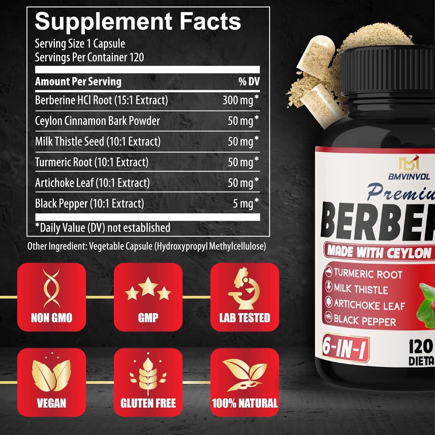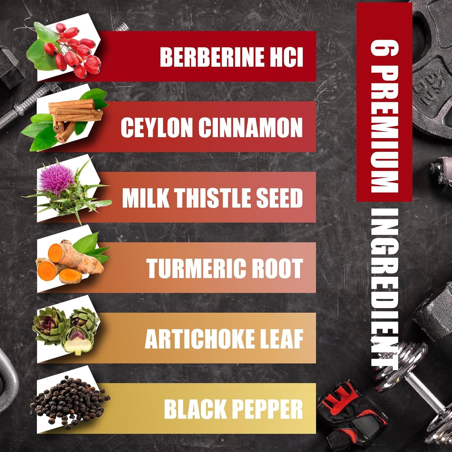 The 6 ingredients are Berberine, Ceylon Cinnamon, Milk Thistle, Turmeric, Artichoke Leaf, Black Pepper.