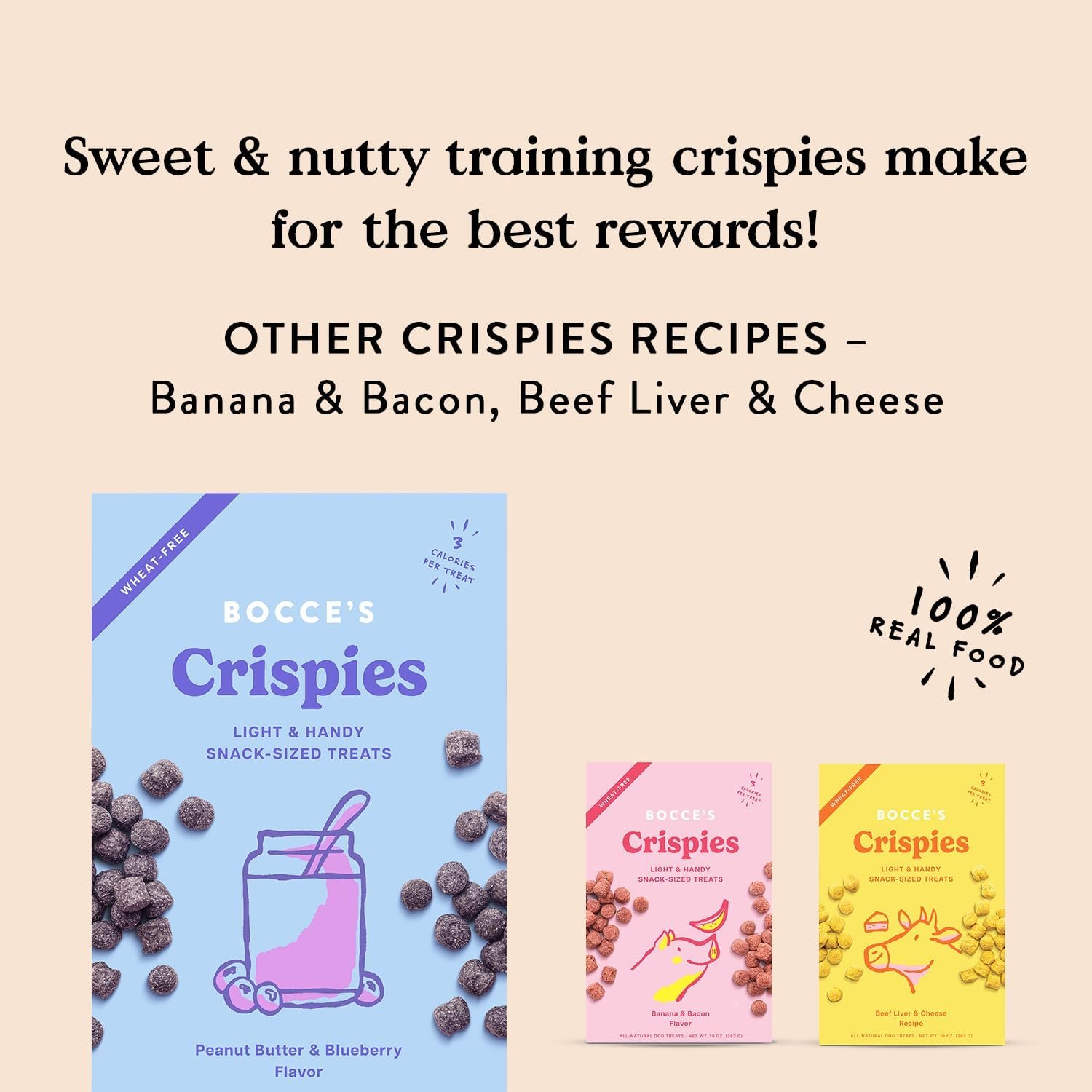 Light and handy snack-sized treats! At only 3 calories per treat, Crispies are perfect for all-day snacking & training. Ingredients: Oats, Rice, Peanut Butter, Blueberry Powder, Fruit Juice Powder, Natural Peanut Butter Flavor, Citric Acid ; Guaranteed Analysis: Protein: 13% Fat: 7% Fiber: 9% Moisture: 10% ; Calories: 3 cal/treat
