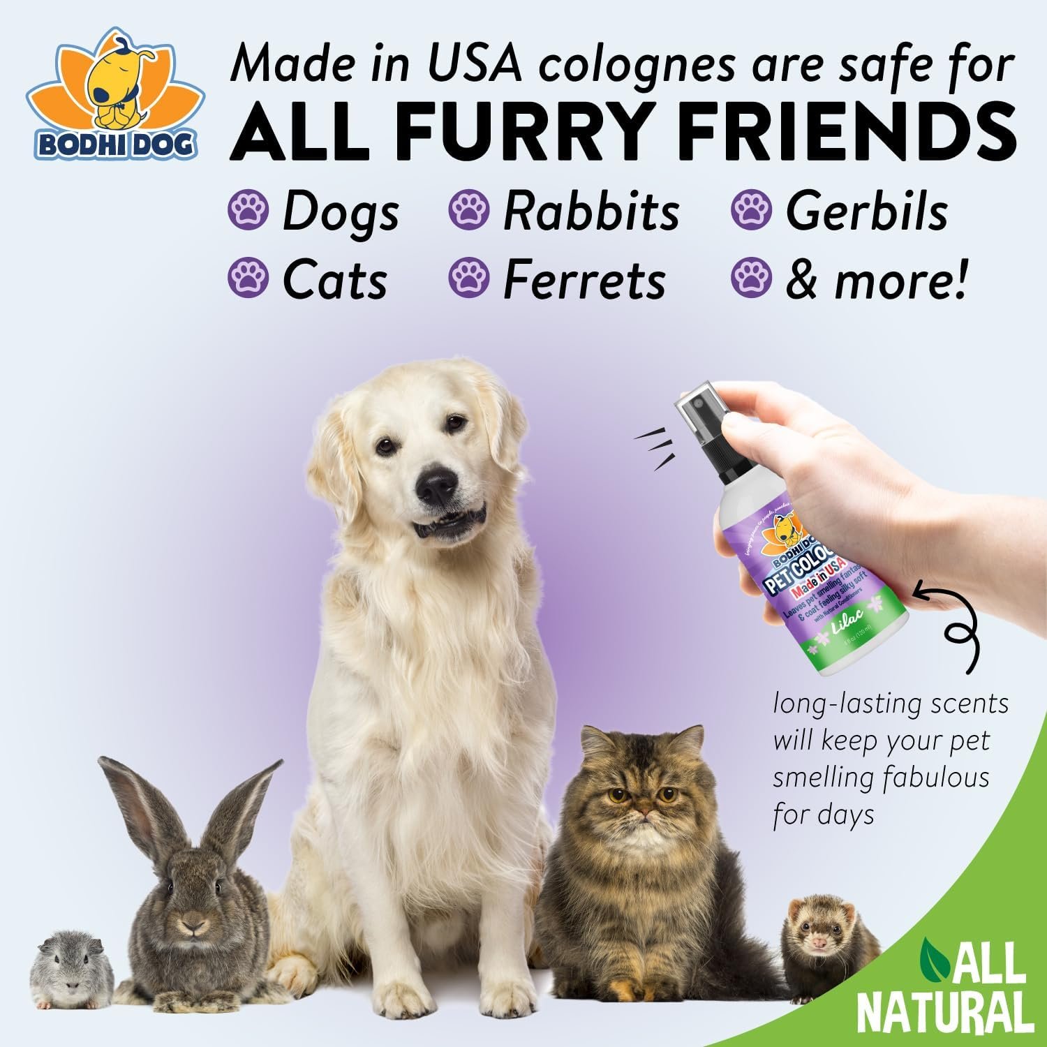 Vet and Groomer Recommended: Our pet perfume offers safe, professional, quality for dogs, cats, puppies, kittens, ferrets, guinea pigs and rabbits of all ages with normal or sensitive skin. It’s suited for all types of fur. We stand behind the quality of our products.