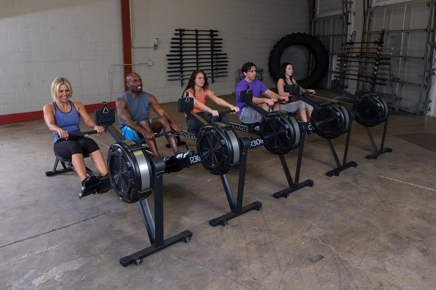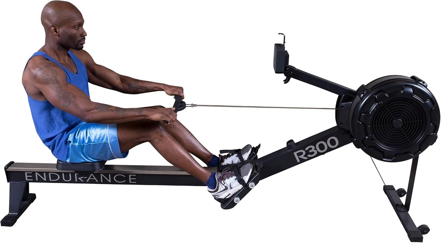 The Endurance by Body-Solid R300 Indoor Rower delivers an effective low-impact cardio and total body workout. Not only does the rowing movement provide users with high-intensity calorie-burning cardio but works quadriceps, hamstrings, abdominals, obliques, lats, biceps, triceps, hip flexors and more. User-controlled air resistance puts users in full control for a balanced and coordinated workout. The R300 is a self-generating machine eliminating power requirements for peak energy efficiency in home or commercial settings. A precision-engineered flywheel design minimizes noise. Nickel-plated chain offers unmatched durability in even the most intense environments. A textured, ergonomic handle allows users to row with natural hand and arm positions while fully adjustable footrests provide users a safe and comfortable workout on the R300 Indoor Rower. A convenient cell phone holder can be used for both entertaining and workout tracking purposes. The interactive console reports on time, heart rate, calories, paddle width, stroke rate, distance cycle and watts and is Polar compatible. 8 different exercise programs -Quick Start, Distance, Time, Calories, Game, Intervals (20/10. 10/20. 10/10) – are also built into the console. Ideal for home, commercial and group workout settings. Rowers have seen a resurgence of popularity in recent years driven in part by their usage in cross fit and other hot exercise programs. Pair this with our other cross fit oriented product like our FB300 Fan Bike and our new Power Racks and Half Racks to satisfy the needs of any training facility.