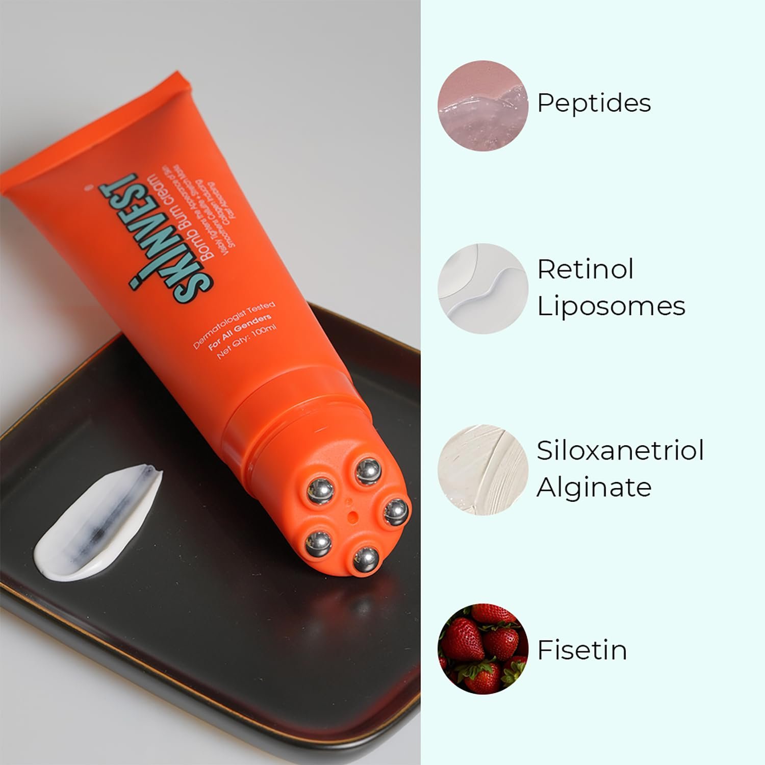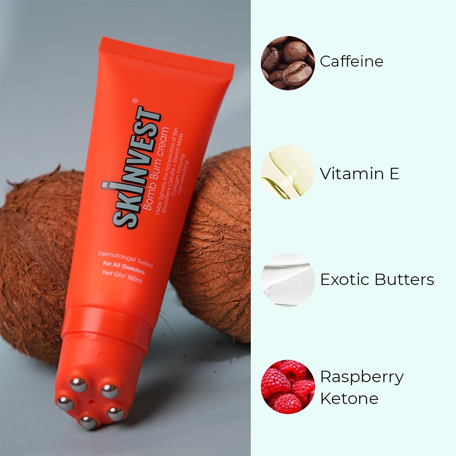 Cellulite and stretch marks reduction body cream with 5 metallic balls massager. Contains Caffeine, Collagen, Antioxidants, Raspberry Ketone and Fisetin.