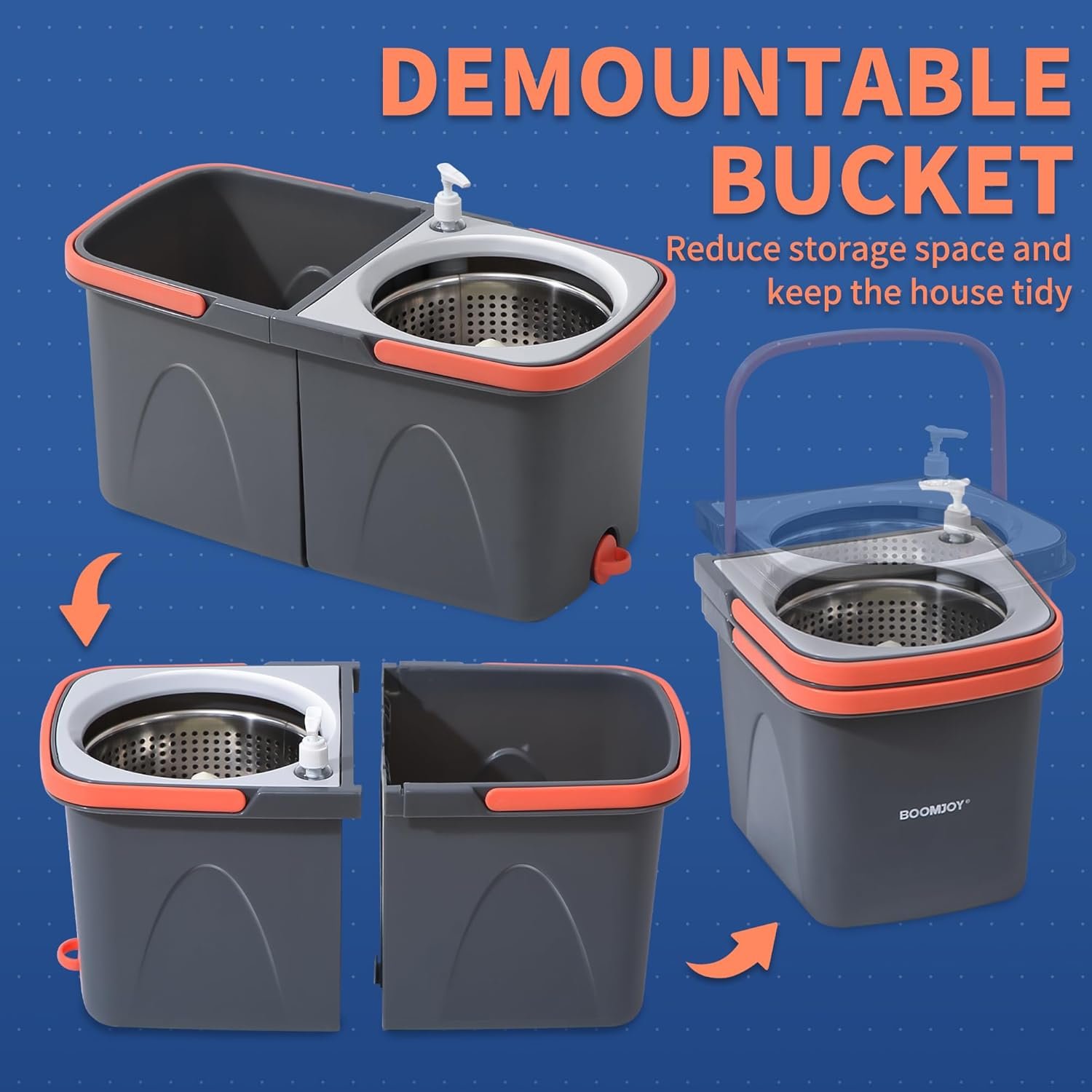 【Separable Bucket】The spinning bucket features a detachable design with a drainage hole, making it easy to drain and clean. It also saves storage space. Tip: Avoid storing the wet mop in the stainless steel basket to prevent rust or damage