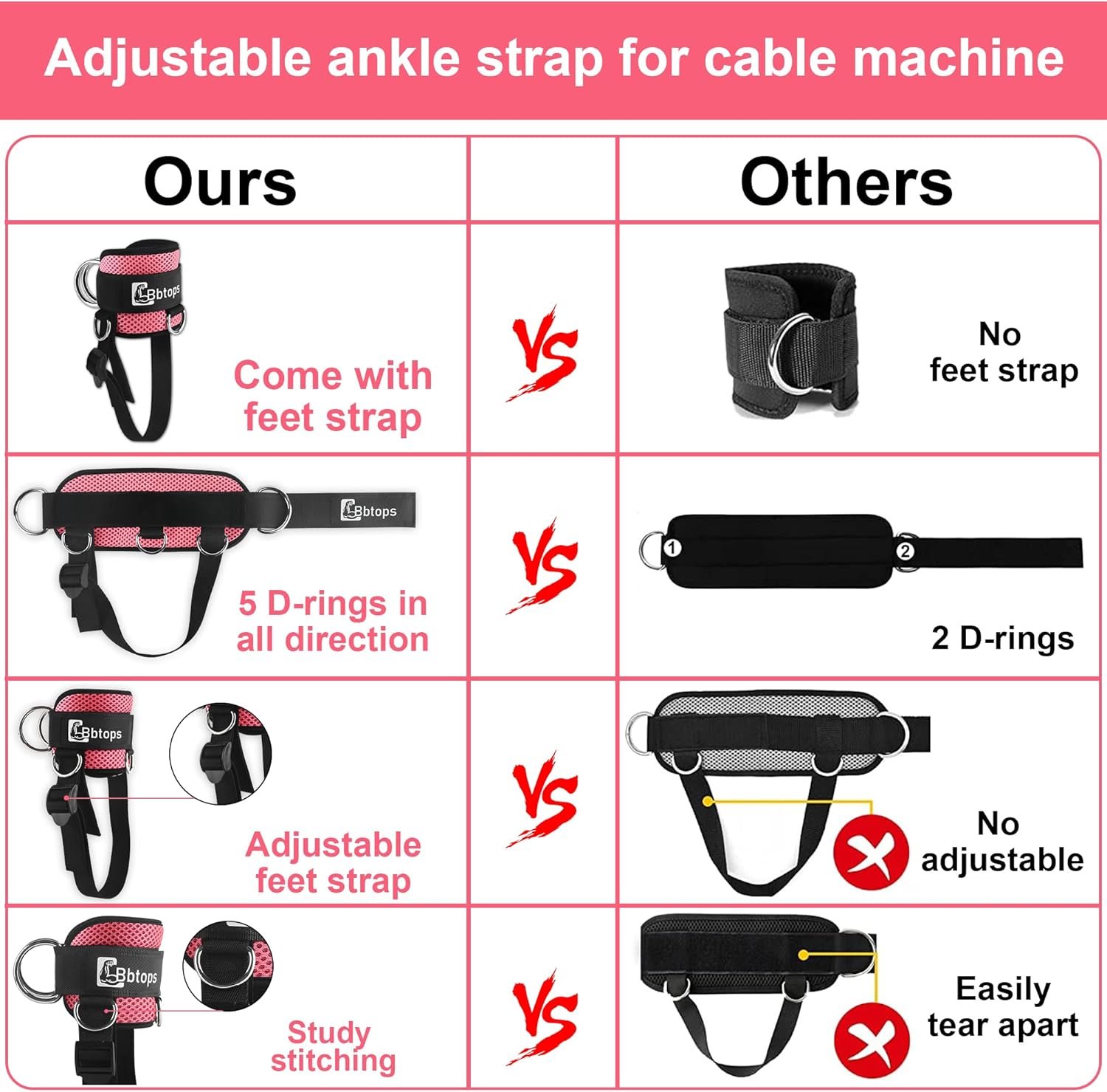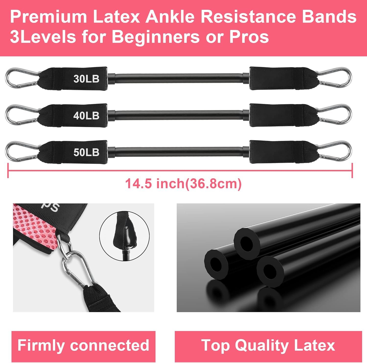 【Ankle Resistance Bands】Bbtops Ankle Resistance Band Set includes 3 resistance bands, 50LB, 40LB, 30LB, Ankle straps Use them for kickbacks, lunges, and donkey kicks to strengthen your legs, hips, and core muscles. Improve your muscle strength, stamina, agility and balance.And can be stacked up to a maximum of 120 lbs.