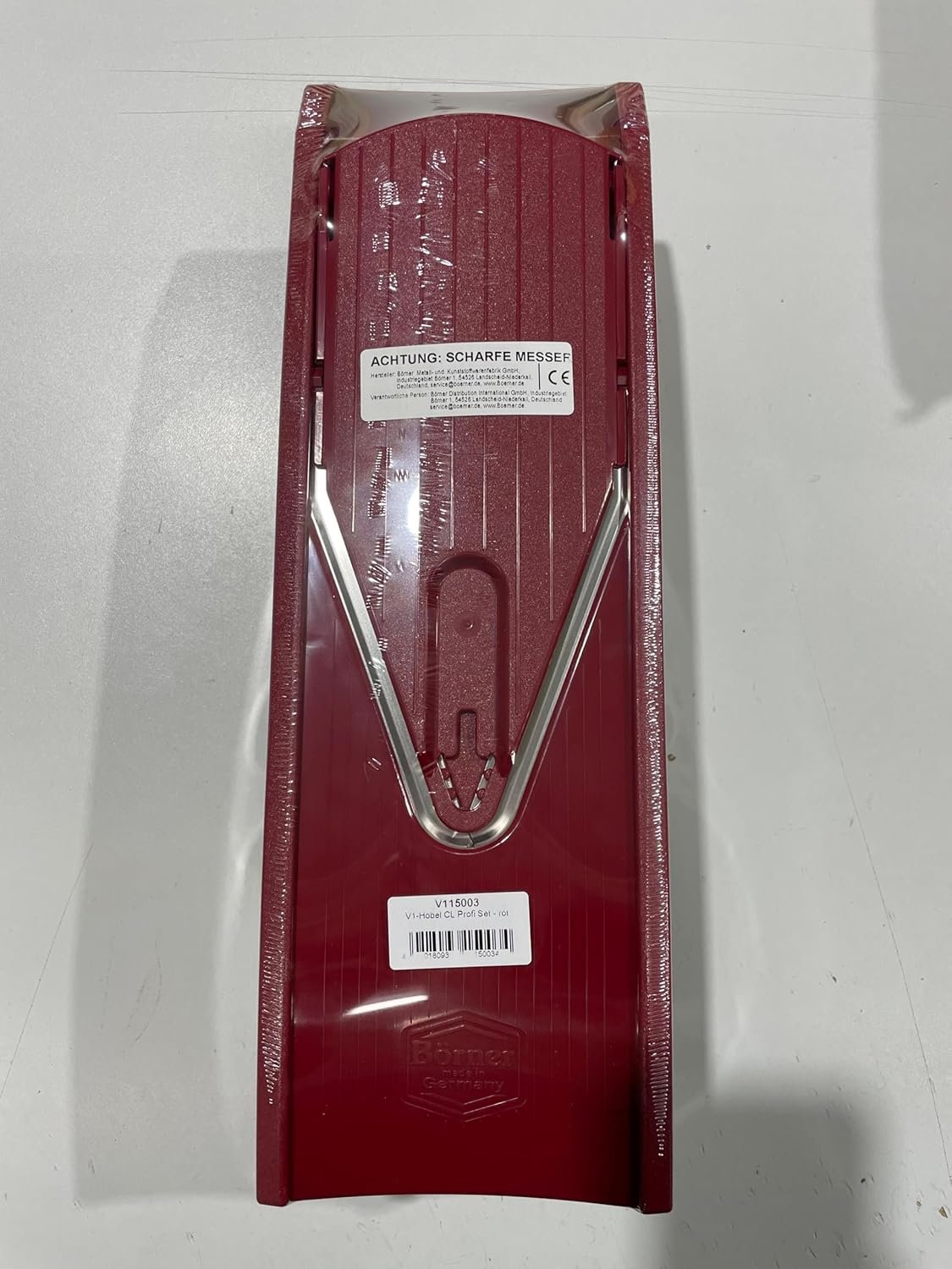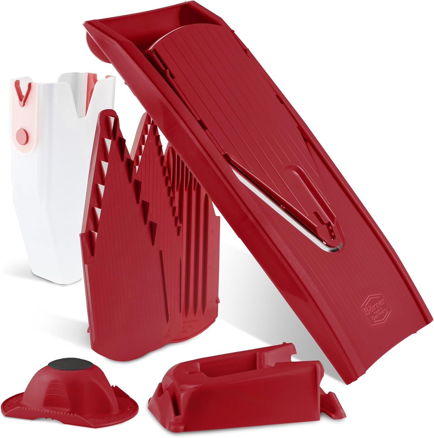 V1 CLASSICLINE (PROFESSIONAL SET) – The Börner V1 Professional Set leaves no wishes unfulfilled! The set includes: V-Slicer, storage box for safely storing the cinserts, docking station for the slicer, and inserts for different cutting styles (e.g., slices, strips, or dices).