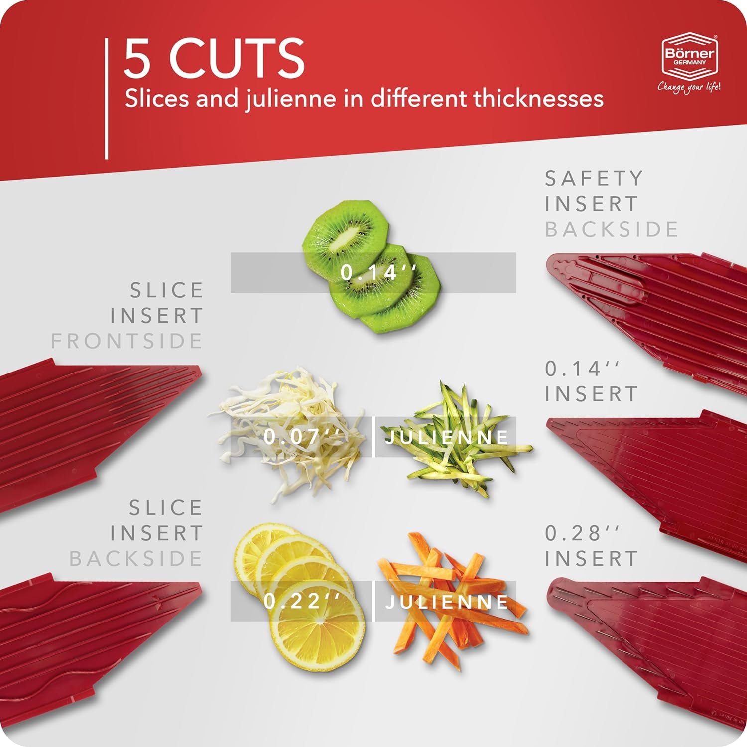 SAFE & EASY TO USE – The set includes a safety fruit holder. The fruit holder serves as a finger guard and protects your fingers from the sharp blades. Additionally, fruits & vegetables can be completely processed until the end. Your fingers are safe from any injuries with our Börner V1 ClassicLine Profi Vegetable Slicer Set.