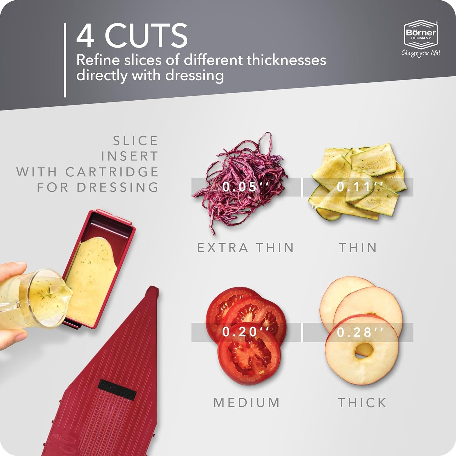 BÖRNER VITAL VEGETABLE CUTTER (BASIC SET) – The Börner Vital V-Slicer is our innovative mandoline slicer with a dressing function. The Vital Multi-Slicer not only allows you to slice in 4 different thicknesses, but it also dispenses dressing onto the vegetables, so the salad ends up in the bowl with dressing and is ready to eat.