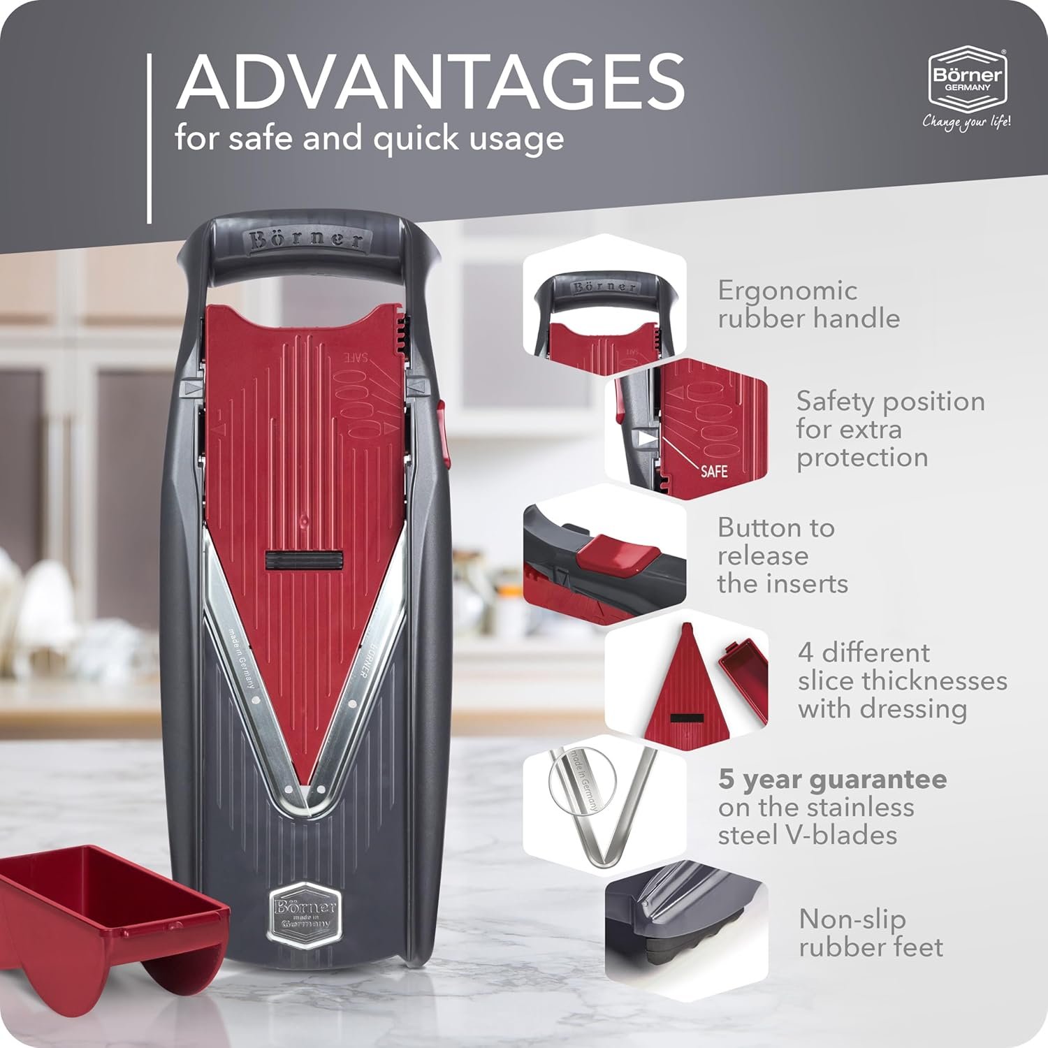 BÖRNER QUALITY “MADE IN GERMANY” – We are the inventors of the V-slicer and have been offering “Made in Germany” quality since 1956. We manufacture every part – including the blades – at our headquarters in the Eifel region. With our practical kitchen helpers, it is finally easy to prepare good and delicious meals. Our products are for everyone.
