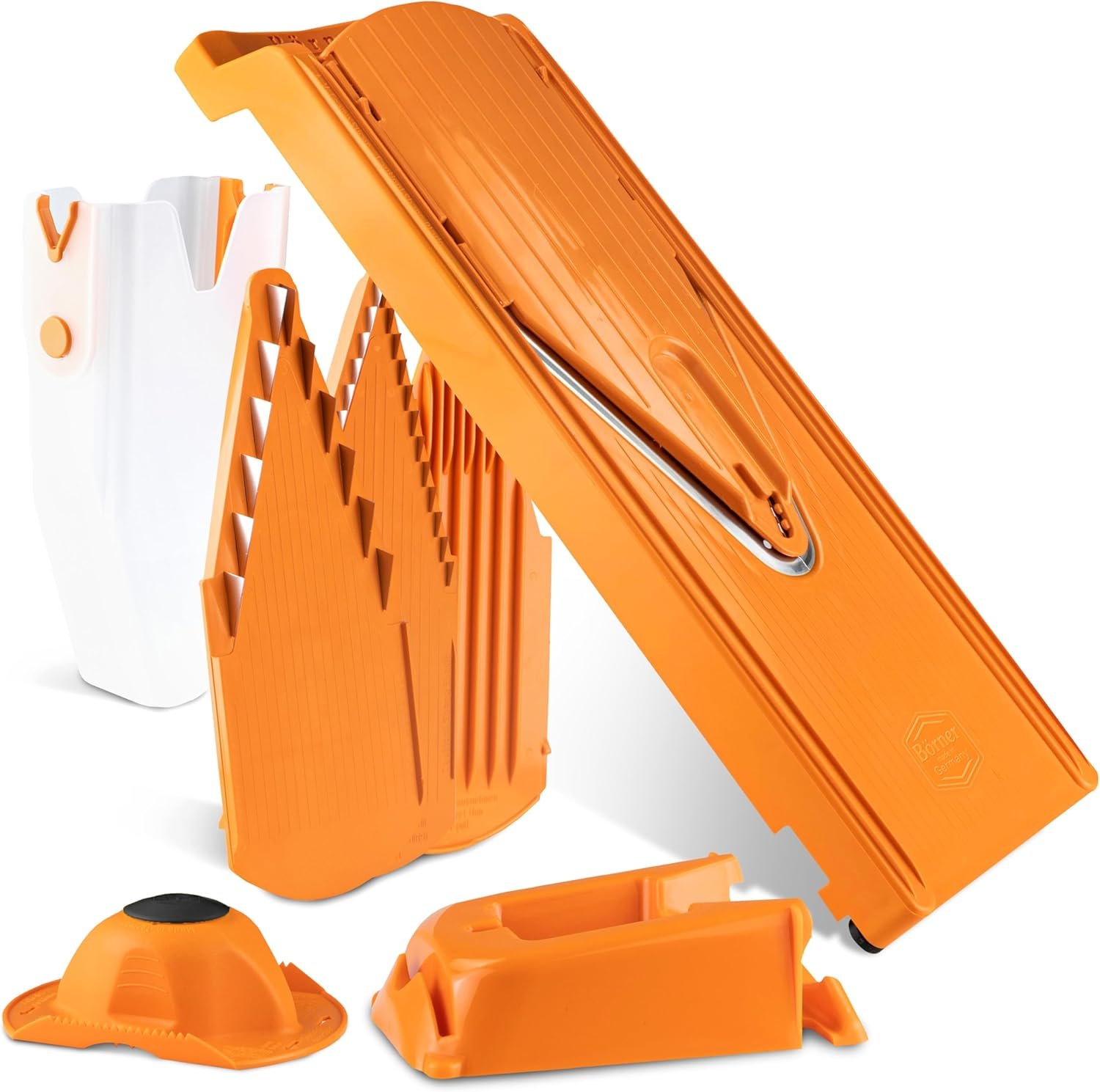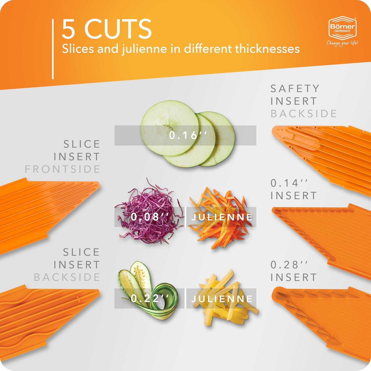 SAFE & EASY TO USE – The set includes a safety fruit holder. The fruit holder serves as a finger guard and protects your fingers from the sharp blades. Additionally, fruits & vegetables can be completely processed. For dices, pre-cut the produce crosswise. Your fingers are safe from any injuries with our Börner V3 Professional Vegetable Slicer Set.