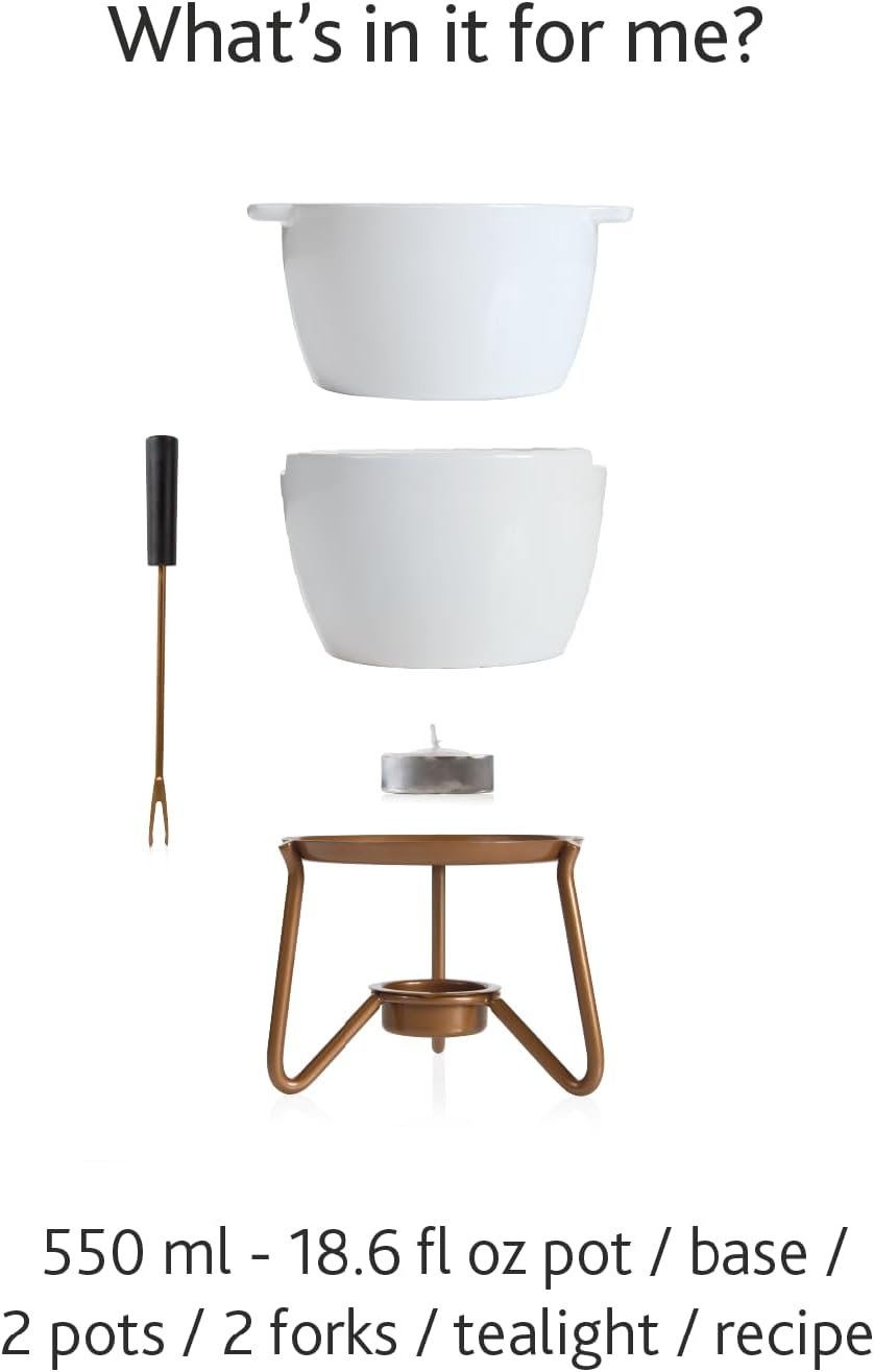 Comes with everything you need: This fondue set comes with 2 ceramic cups, a stainless base, 2 fondue forks and a tea light (chocolate not included).